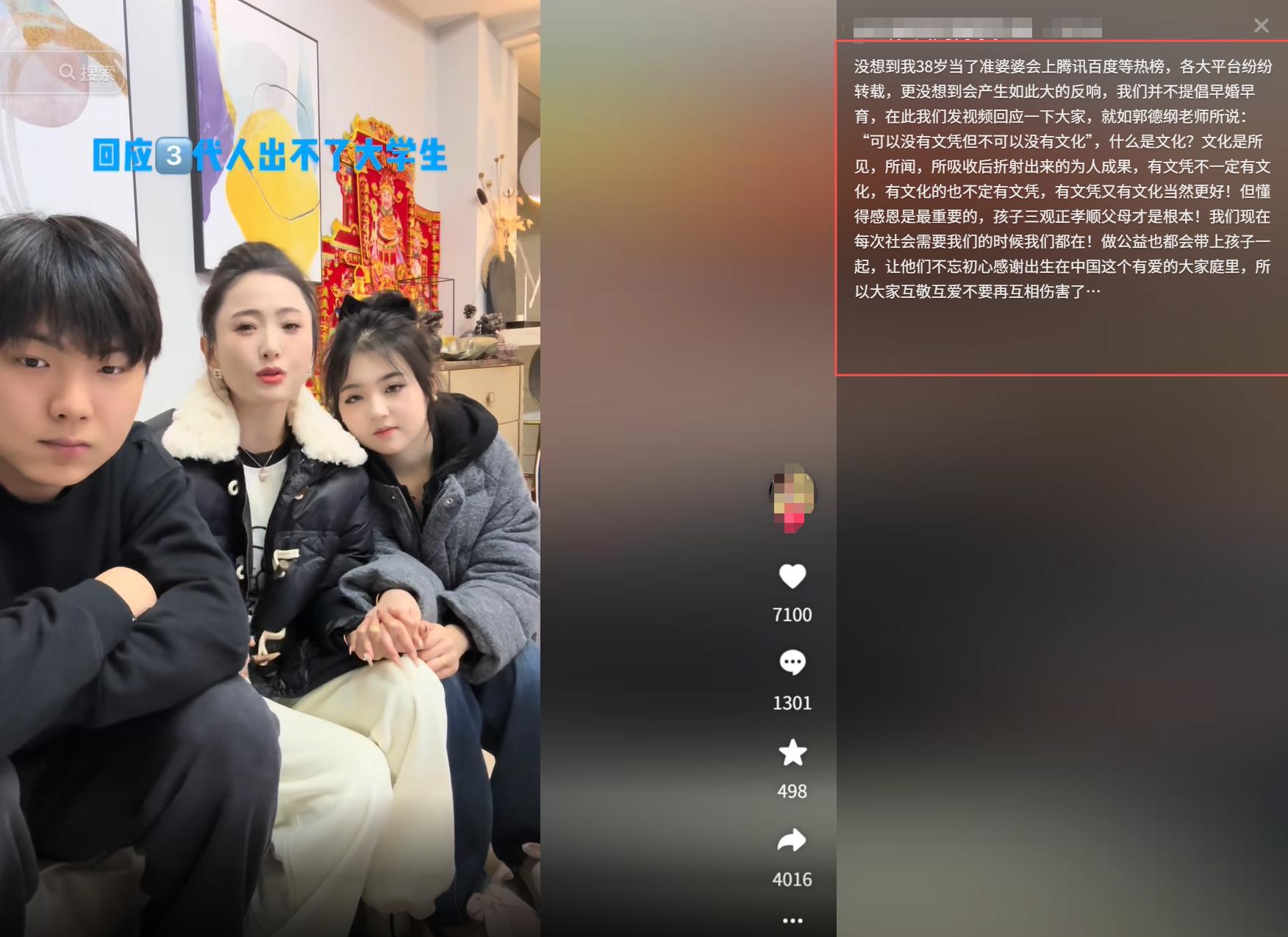 “最年輕婆婆”被網友羣嘲三代都無大學生回應:夫妻皆書香門第