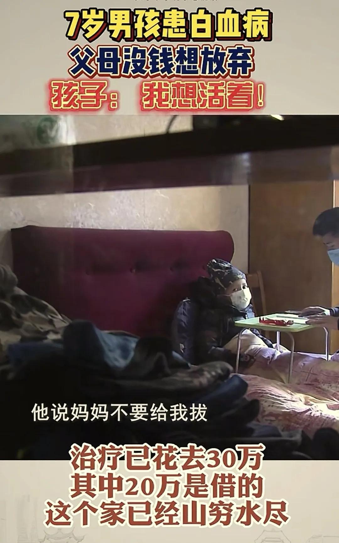 七歲的小遠家境貧寒,卻偏偏患上了急性白血病,前期治療花了30萬,其中20萬是借的,父母很崩潰,因爲沒有錢想要放棄了,打電話跟醫生說想把孩子身上的管拔了,因爲家裏面沒有錢了,不想被小孩聽到了,小孩哭着跟媽媽說:不要拔我的管子,我想活着……