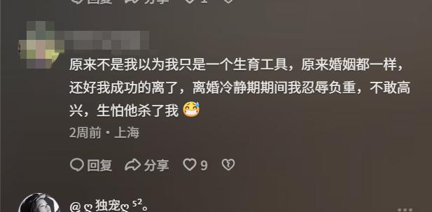 以爲這只是極個別的案例,萬萬沒有想到評論區裏面也有網友有這樣的同款,她說自己也是一個生育工具,在離婚冷靜期的時候忍辱負重,幸好離了婚……