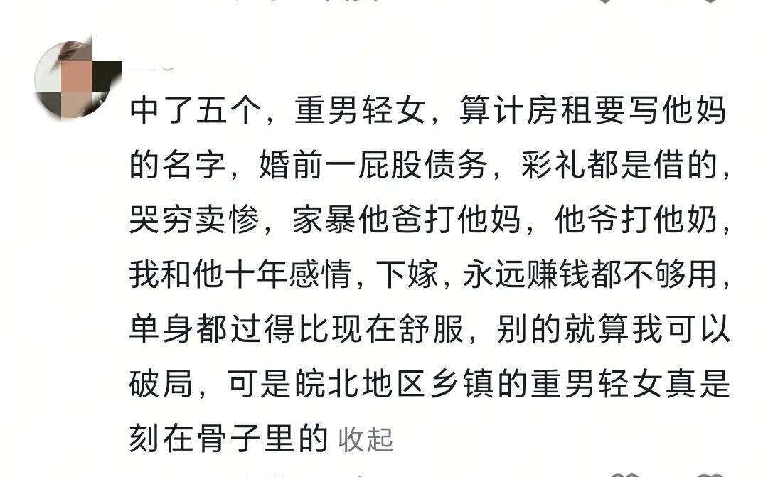 一個安徽的網友就說自己中了5個,重男輕女,算計,房租都要寫他媽媽名字,婚前一屁股債,彩禮都是借的,經常哭窮,賣慘,家暴,所以自己賺的錢永遠都是不夠用的,單身都要比現在舒服很多。