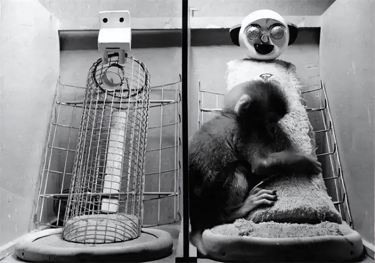 還有一個非常著名的恆河猴實驗,就是心理學家哈洛做的一個實驗,因爲恆河猴的基因有94%跟人類是相同的,所以他找了兩個假的猴子代替母猴,有一隻是用鐵絲做的,胸前掛着一個奶瓶,24小時提供奶水,另外一隻假猴是用絨布來做的,摸起來比較舒適和柔軟,但是它沒有食物。
