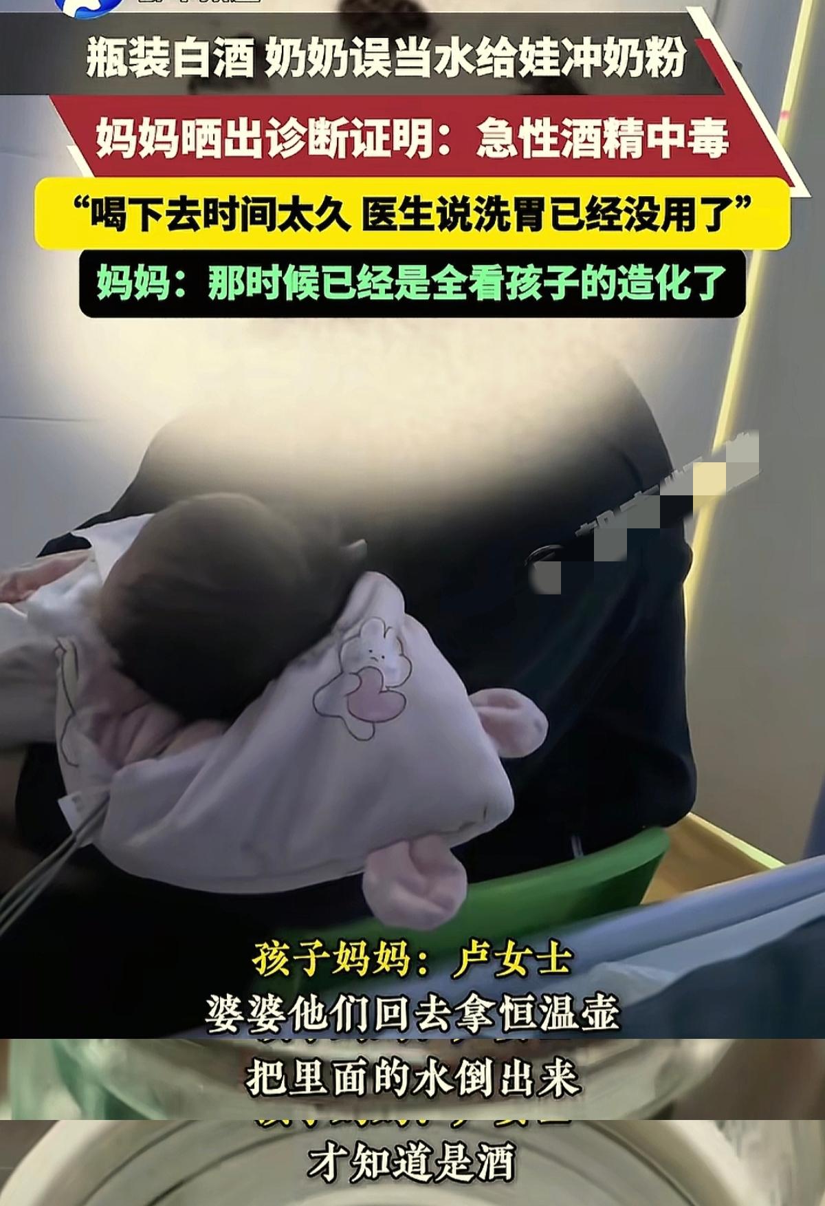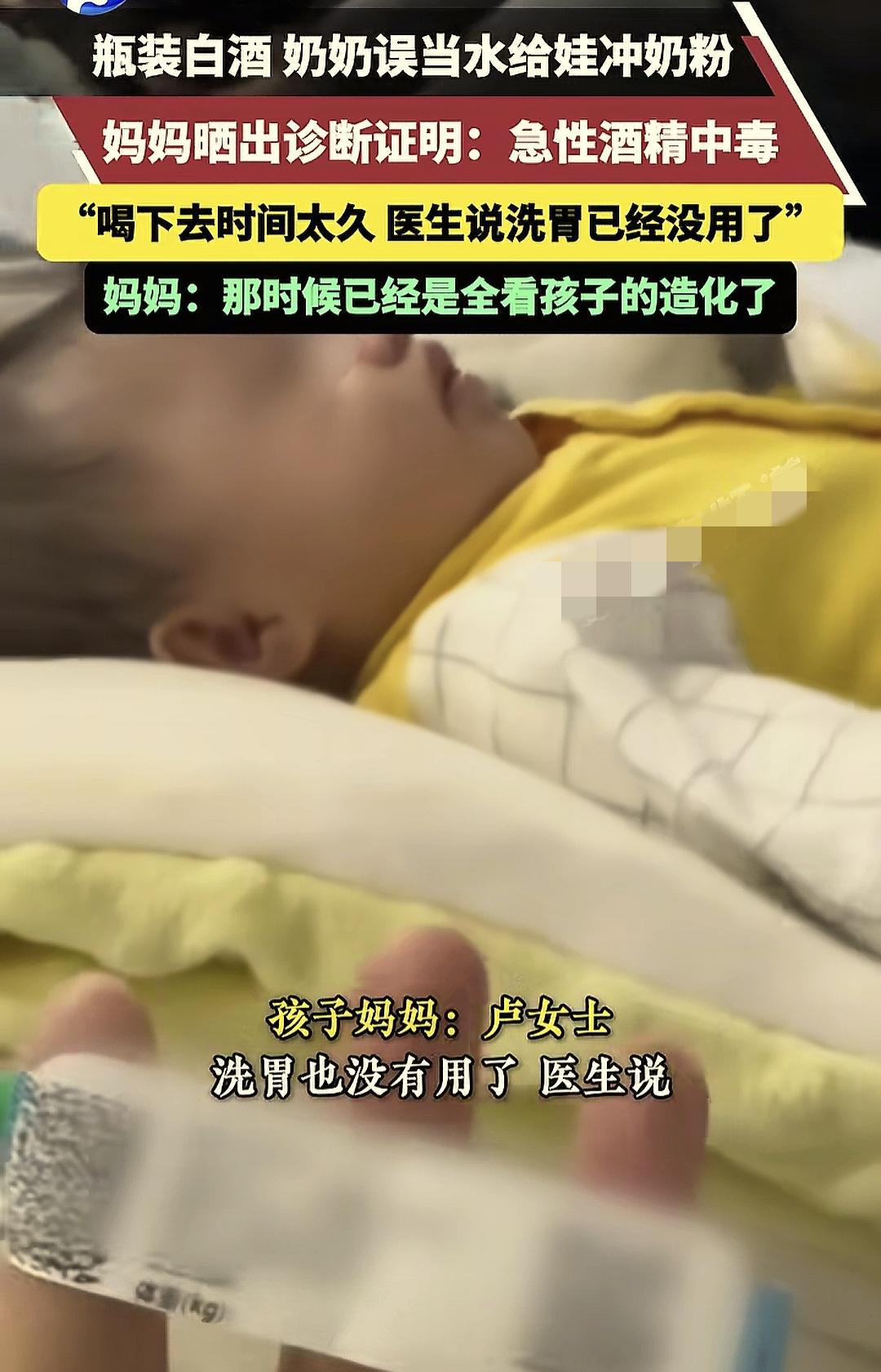 奶奶想到剛纔就是用這些酒來給孩子衝奶的,感覺自己心都要碎了。趕緊把這個消息跟醫院裏面的醫生說,醫生聽了之後趕緊給孩子進行檢測,發現孩子確實是急性酒精中毒。