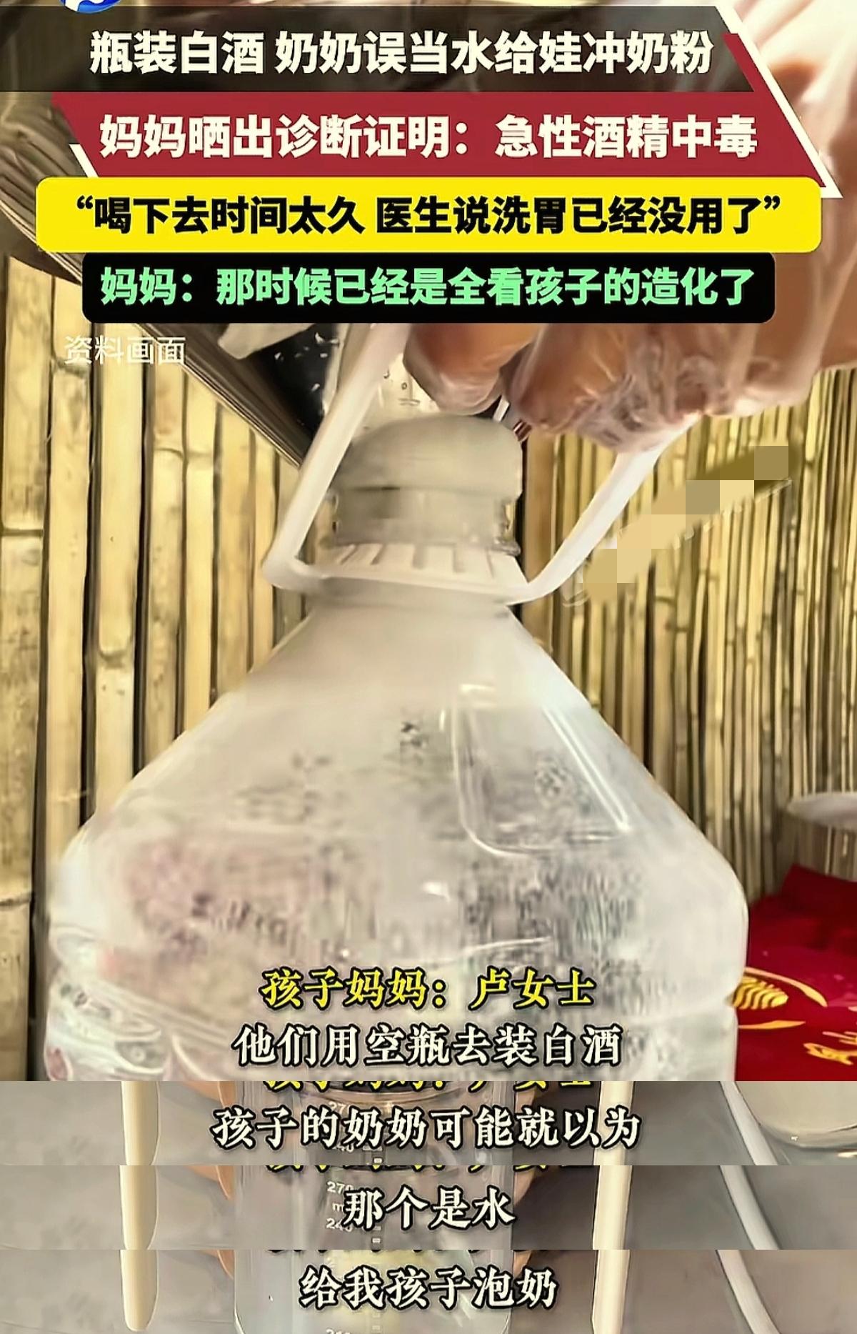 貴州有一個孩子喝奶的時候喝下了大量的酒,原因真的是比竇娥還冤,原來是家裏面有人用大桶的純淨水瓶來裝白酒,而奶奶可能覺得那應該就是礦泉水,所以就把水燒開,然後放涼給孩子衝奶。