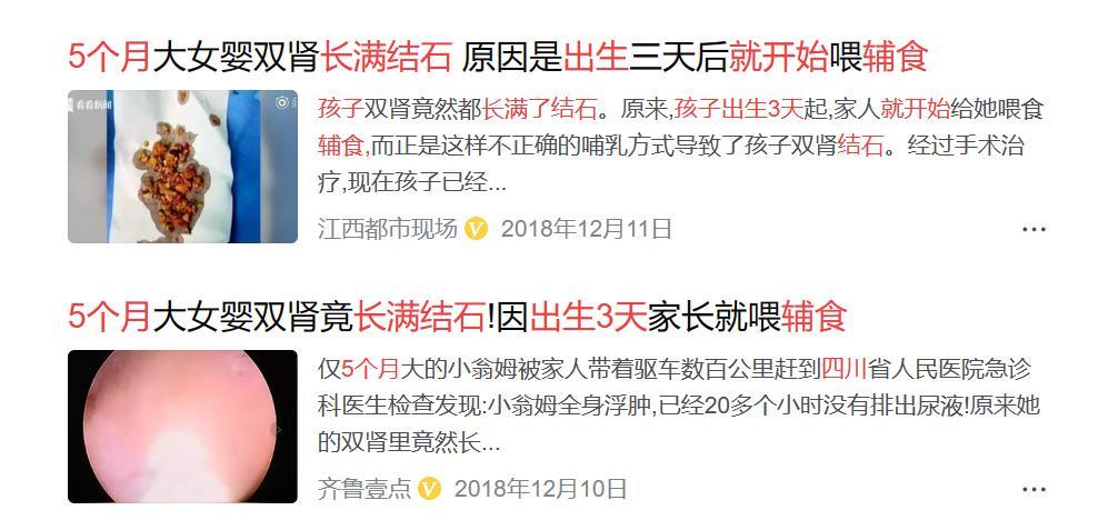 你看前段時間有個新聞,那個孩子就是出生幾天就喫輔食,後來20天不拉尿,然後送到醫院得緊急動手術,在他的肚子裏面就挖出很多的結石,說着還把那個新聞放了出來給自己的親媽看了。