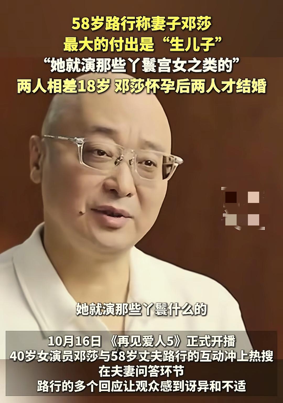 按理說一個能演這麼出名電視劇的演員,她的收入應該還不錯,但是在她參加《再見愛人5》的時候,她的民營企業家老公路行卻評價自己的妻子:生兒子就是最大的付出。也就是他覺得妻子這一輩子最大的成就就是生了一個兒子。