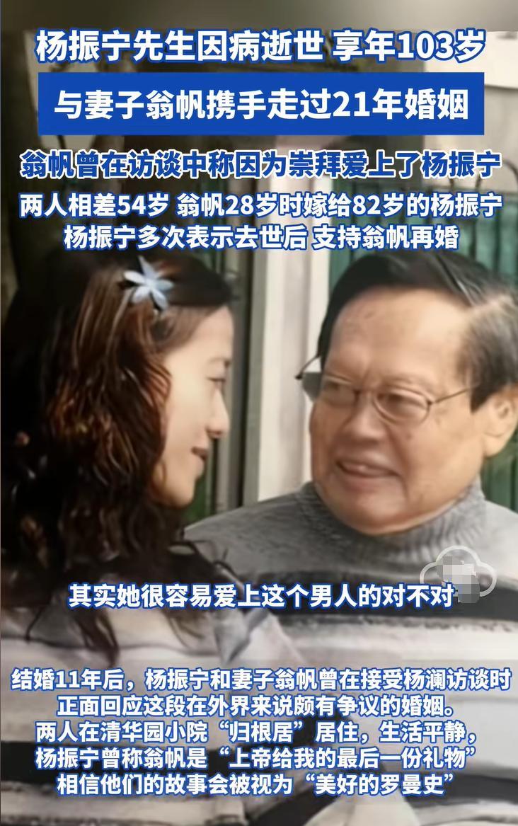 這樣的一段不被看好的婚姻卻整整持續了21年,在103歲的楊振寧離世之後這段婚姻畫下句號,而且是非常完美的句號。