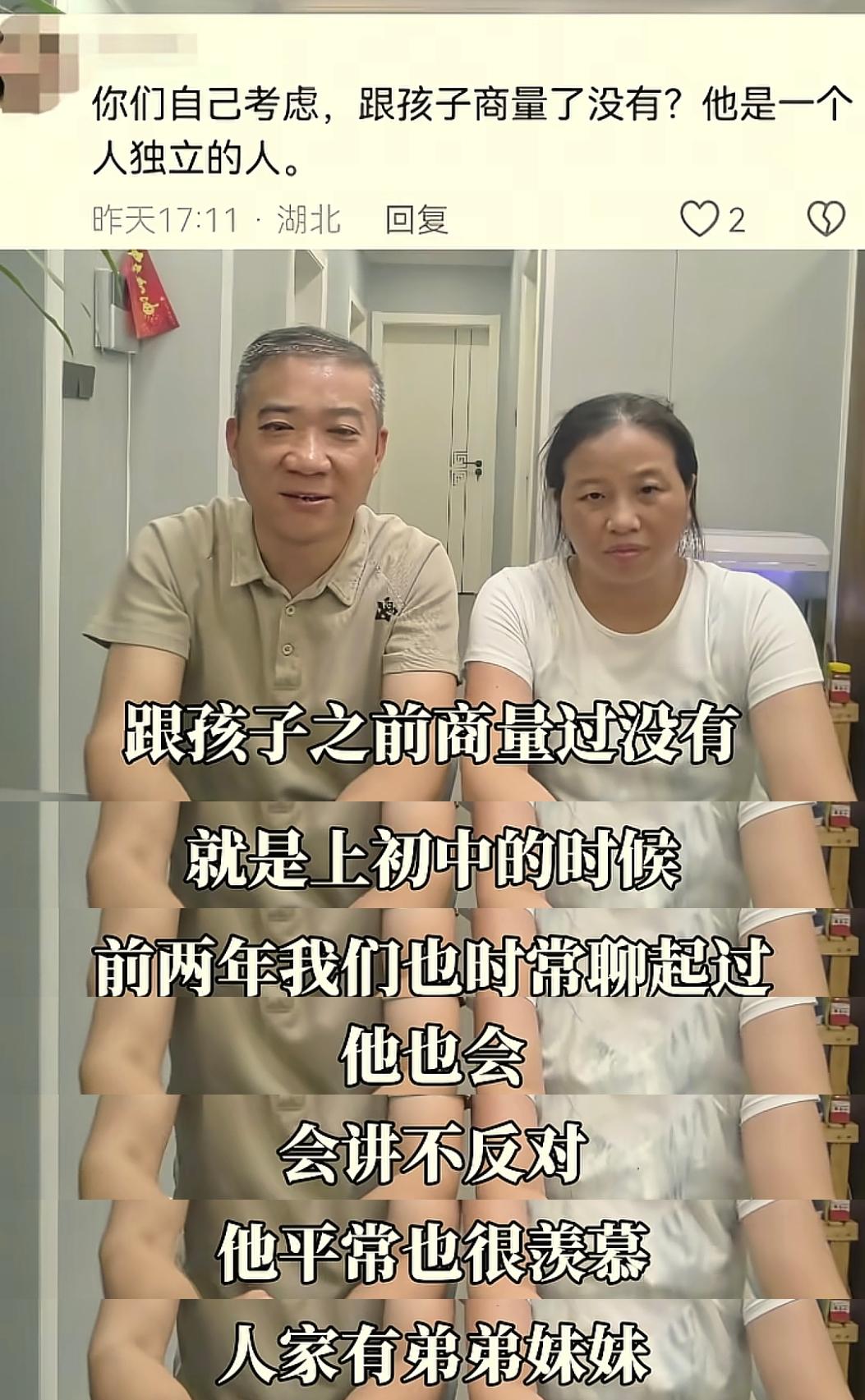 而這對夫妻給出的回應就是其實在初中的時候,老大也曾經想過要弟弟妹妹,因爲老大在提到同學有弟弟妹妹的時候是心生羨慕的,覺得有兄弟姐妹也是一件愉悅的事情。