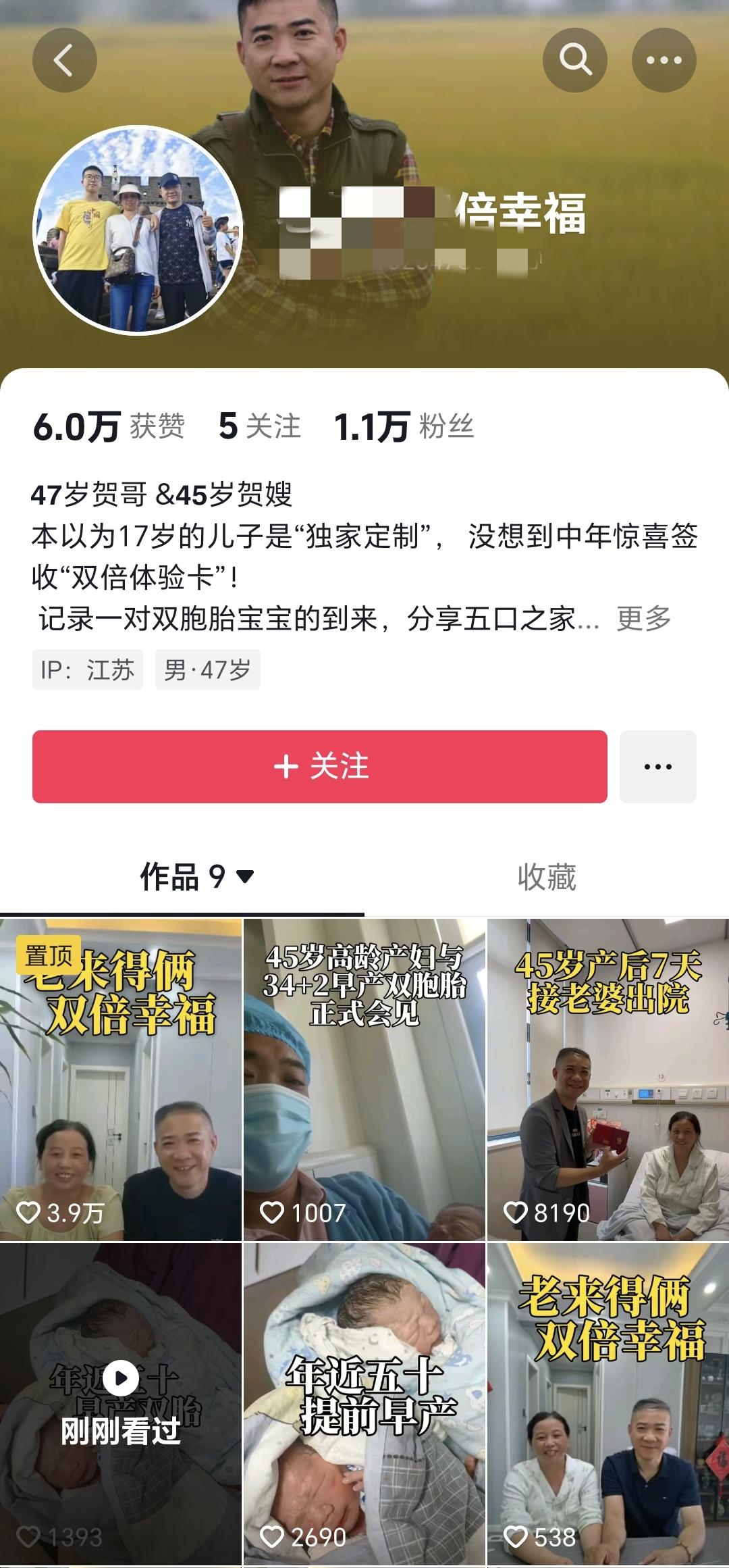 這對夫妻的心理素質還是不錯的,依然繼續在網上發高齡懷上雙胞胎的一些視頻,本來預產期是11月份的,後來因爲又是高齡又是雙胞胎,孩子在34周+2天就早產了。