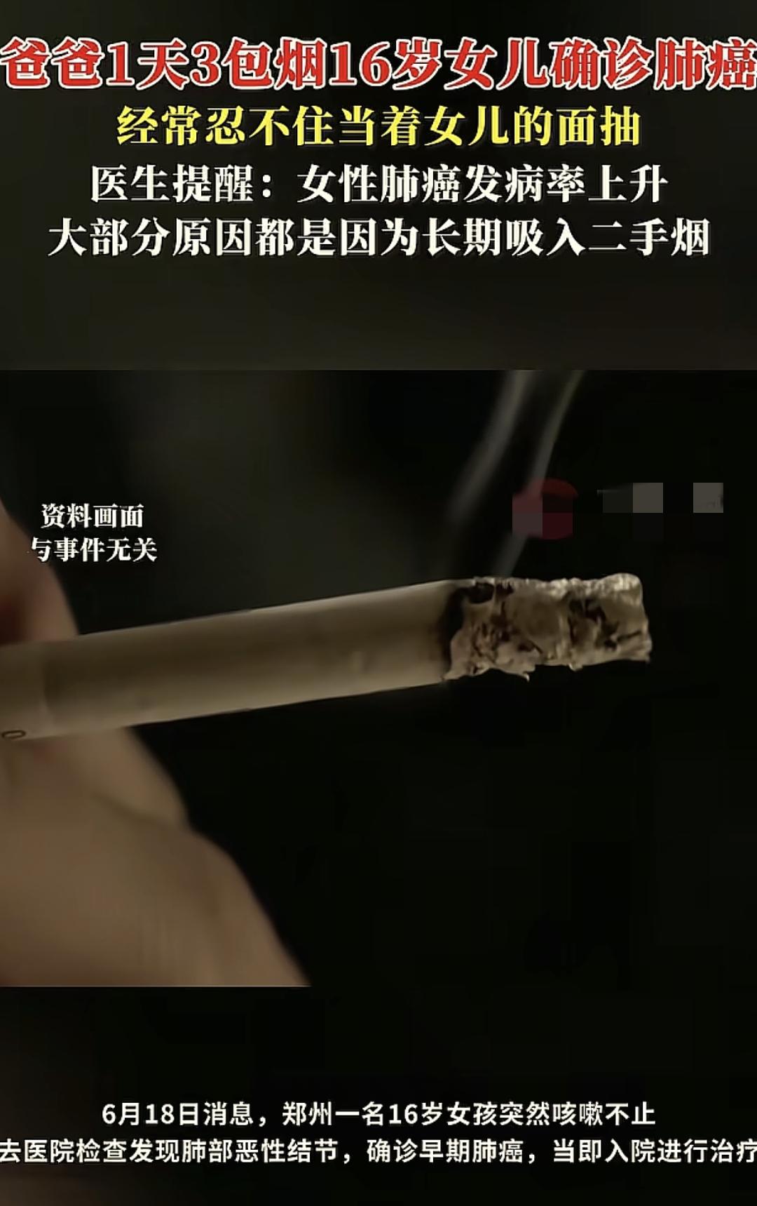 還有河南鄭州一個16歲的女孩子,也是咳嗽不止,去醫院檢查的時候發現肺部是惡性的結節,確診爲早期的肺癌,當即住院治療。醫生詳細詢問後就發現這個孩子的爸爸一天3包煙,而且經常忍不住當着女兒的面抽,女兒長期吸二手菸就導致了肺癌。