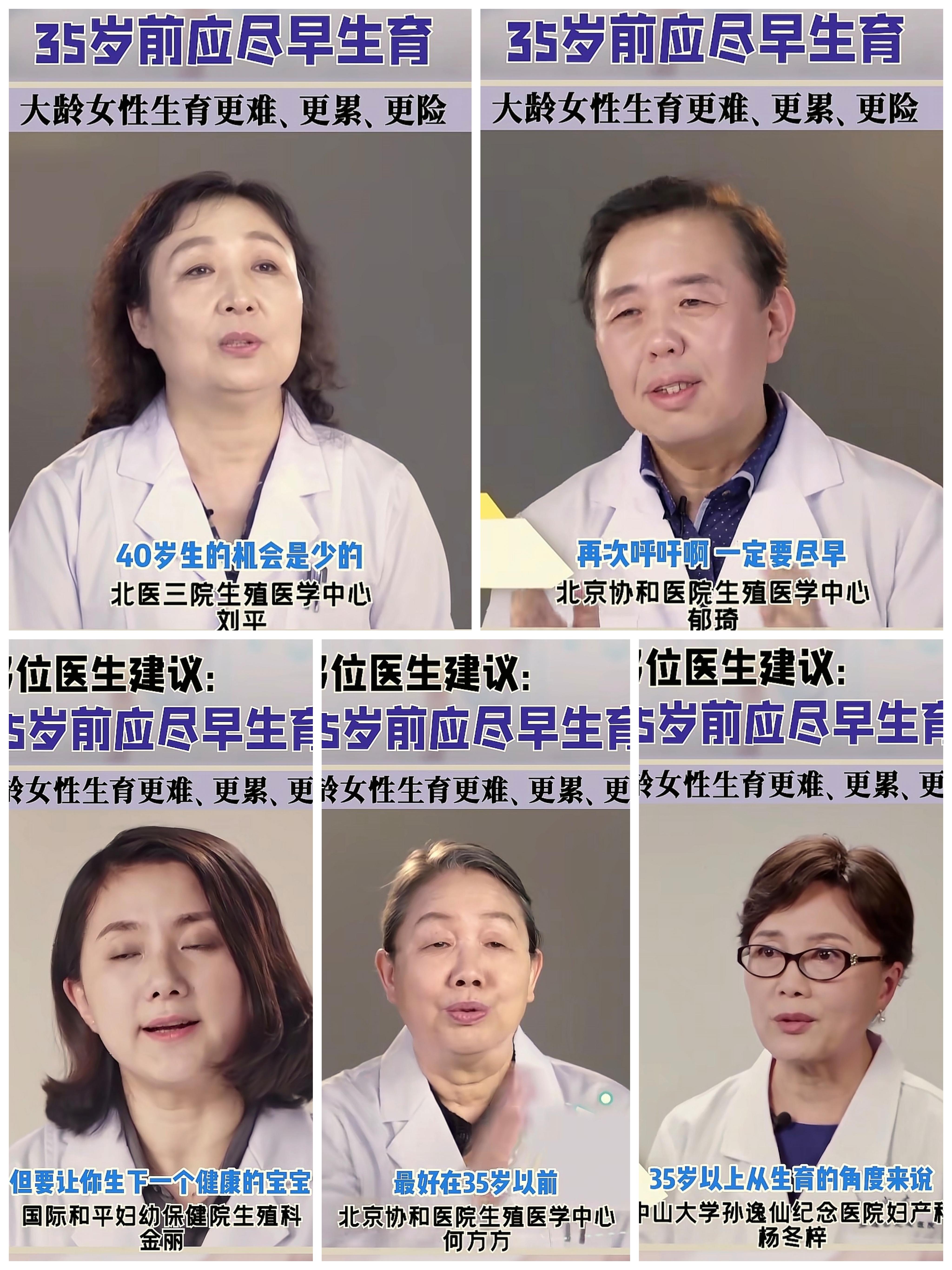 北京協和生殖醫學中心的鬱琦、何方方,中山大學醫院婦產科楊冬梓,北醫三院生殖中心劉平,國際和平婦幼保健生殖科金麗都齊齊向女性呼籲:女性生孩子真的要趁早,建議35歲之前就要生育了,超過35歲生育會更難更累更危險,其實也就是建議超過35歲那就別生了。