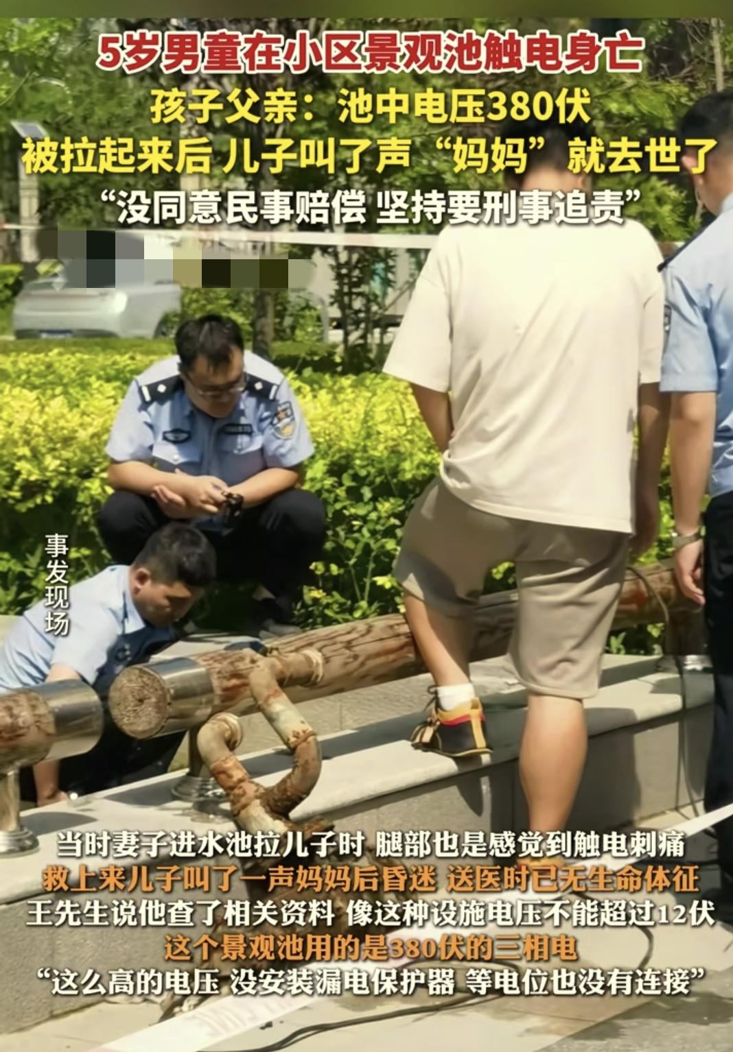 估計孩子的媽媽當時覺得孩子摔摔沒有關係,因爲孩子平時摔倒了就馬上爬起來,沒有想到孩子摔在水池裏面似乎很痛苦的樣子,媽媽就趕緊下到水池裏面想把兒子拉起來,等媽媽走進兒子身邊的時候,卻發現腿部感覺到有一種刺痛感,好像是觸電一樣,趕緊把兒子拉上來。