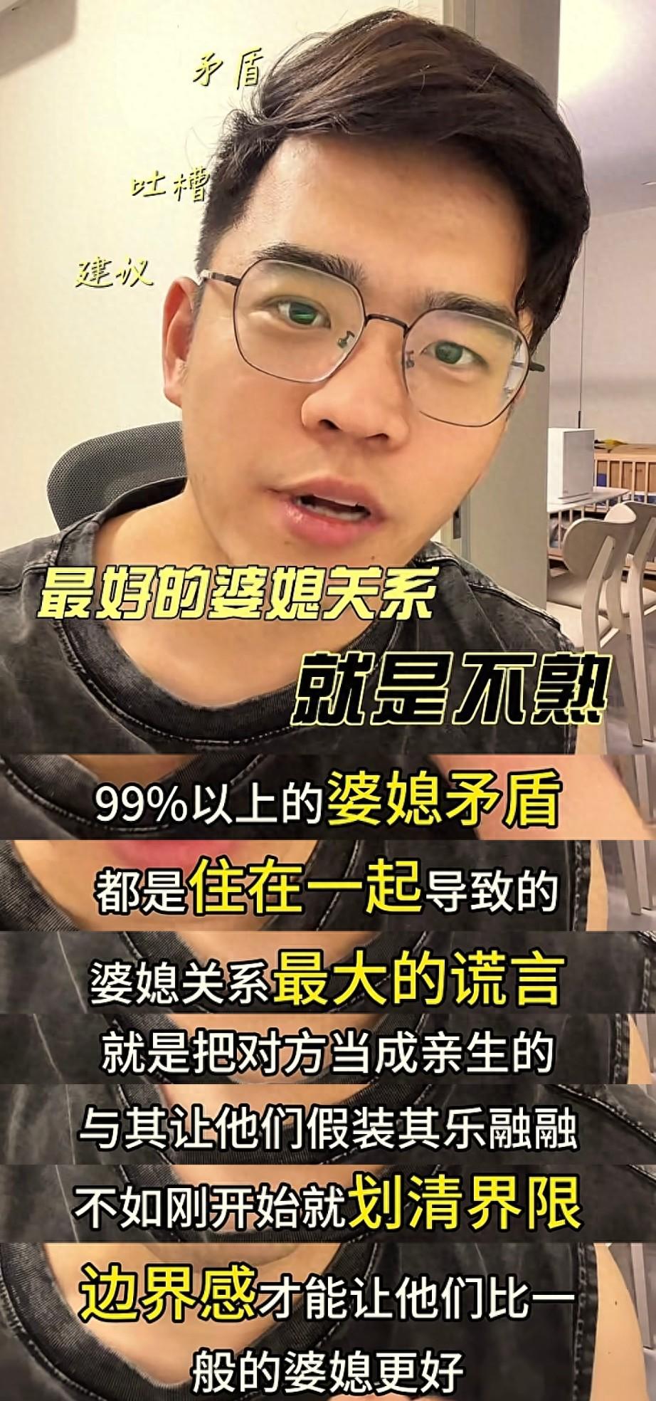 但一個爸爸卻出來現身說法提到:最好的婆媳關係就是不熟,99%以上的婆媳矛盾都是住在一起導致的!所以婆婆和媳婦從一開始就要劃清界限,有邊界感才能讓她們比一般的婆媳更好。