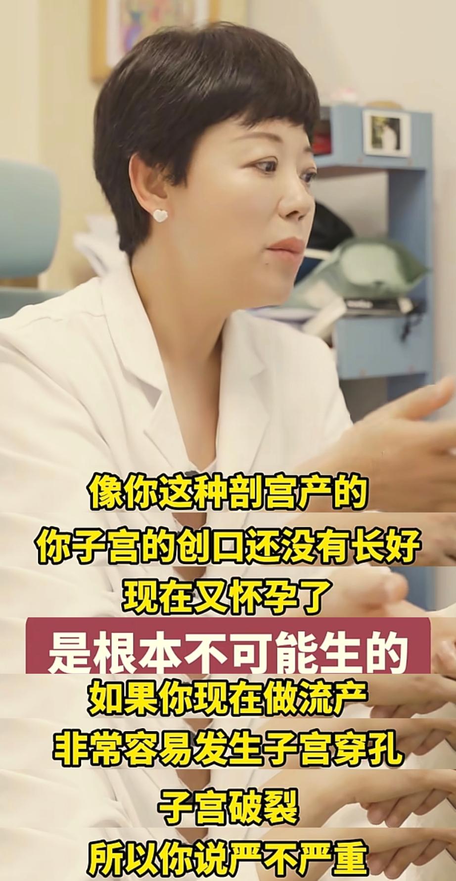 醫生就告訴她:這個時候懷孕很容易流產或者是胎盤粘連,如果你要生的話,也有可能會增加早產的機會,還可能會增加大出血的幾率,甚至可能會出現子宮破裂這些併發症。