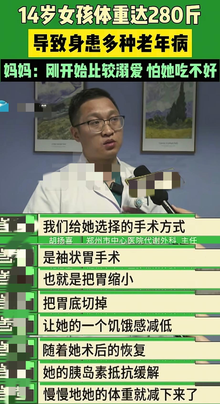結果到醫院一檢查,媽媽更是後悔不已,孩子已經得了各種老年病,這個減肥已經晚了,必須給孩子動手術,因爲孩子的胃已經被撐大了,要給孩子的胃做減容手術,把孩子的胃變小,讓孩子的食慾變少一些,讓孩子慢慢地體重降下來,孩子的各種疾病才能得到控制。