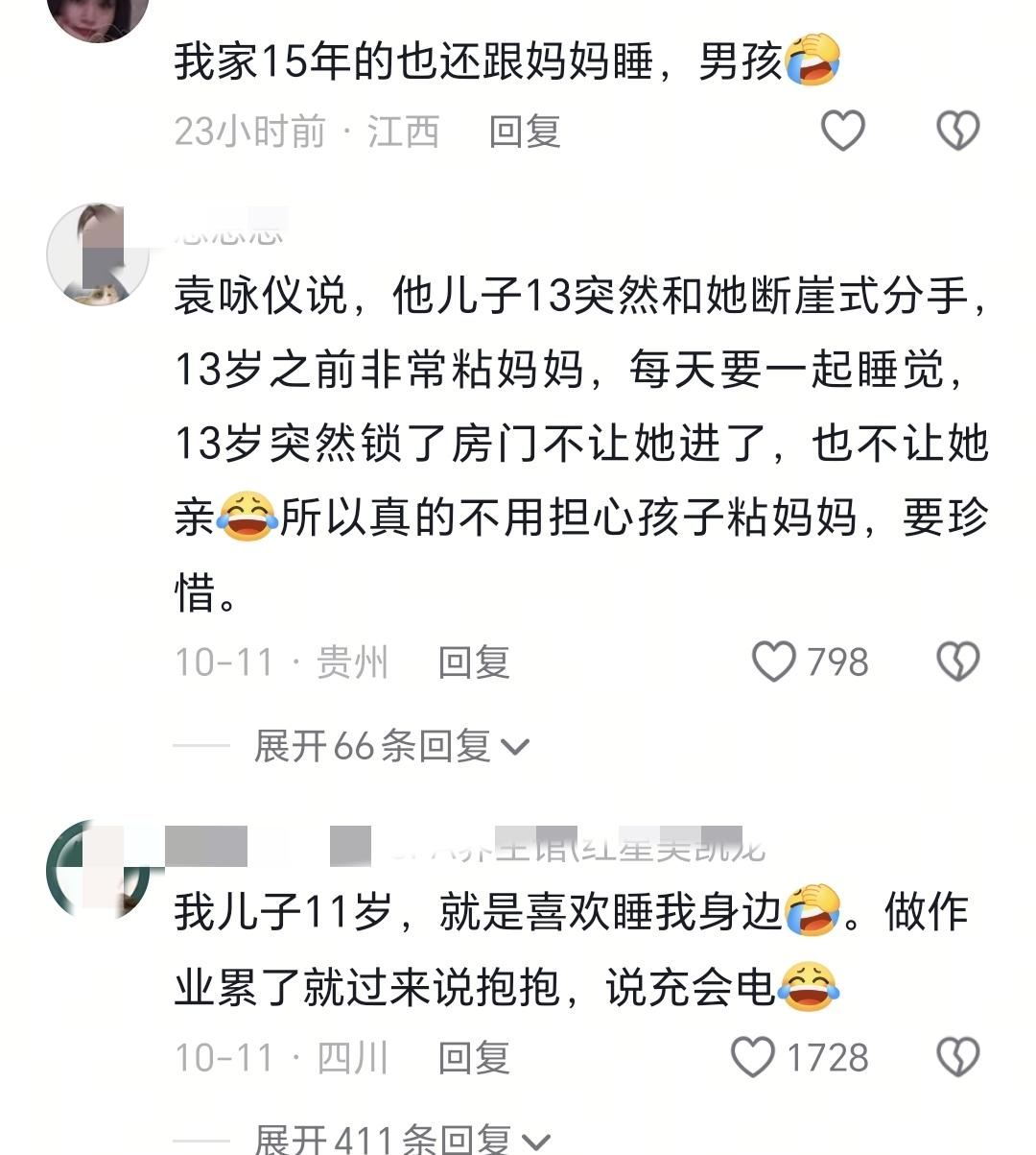 其實真的不是這樣子的,有一個網友就提到袁詠儀曾經說過她的兒子13歲突然跟她斷然式分手,13歲之前非常黏媽媽,每天要一起睡覺,13歲突然鎖着房門不讓她進了,也不讓她親,其實孩子黏媽媽真的是有一定的期限的。