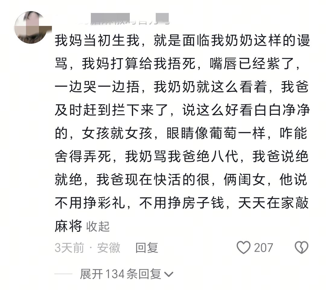 一個同樣是安徽的網友就提到她的媽媽生她下來的時候,她的奶奶就一直在罵媽媽,剛生下孩子的媽媽聽到自己的婆婆這麼謾罵,再加上自己在家裏面地位不高,憤怒之下就用手捂住孩子的嘴和鼻子,就打算把孩子給捂死,媽媽一邊捂自己親生的孩子一邊哭。