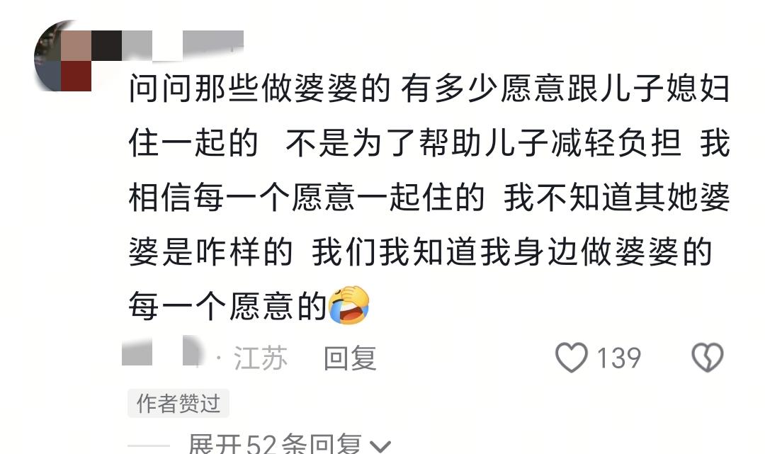 還有一個江蘇的網友站在婆婆的角度上說:有多少婆婆願意跟兒子兒媳婦住在一起的,不是爲了幫助兒子減輕負擔,相信沒有一個願意住一起的。