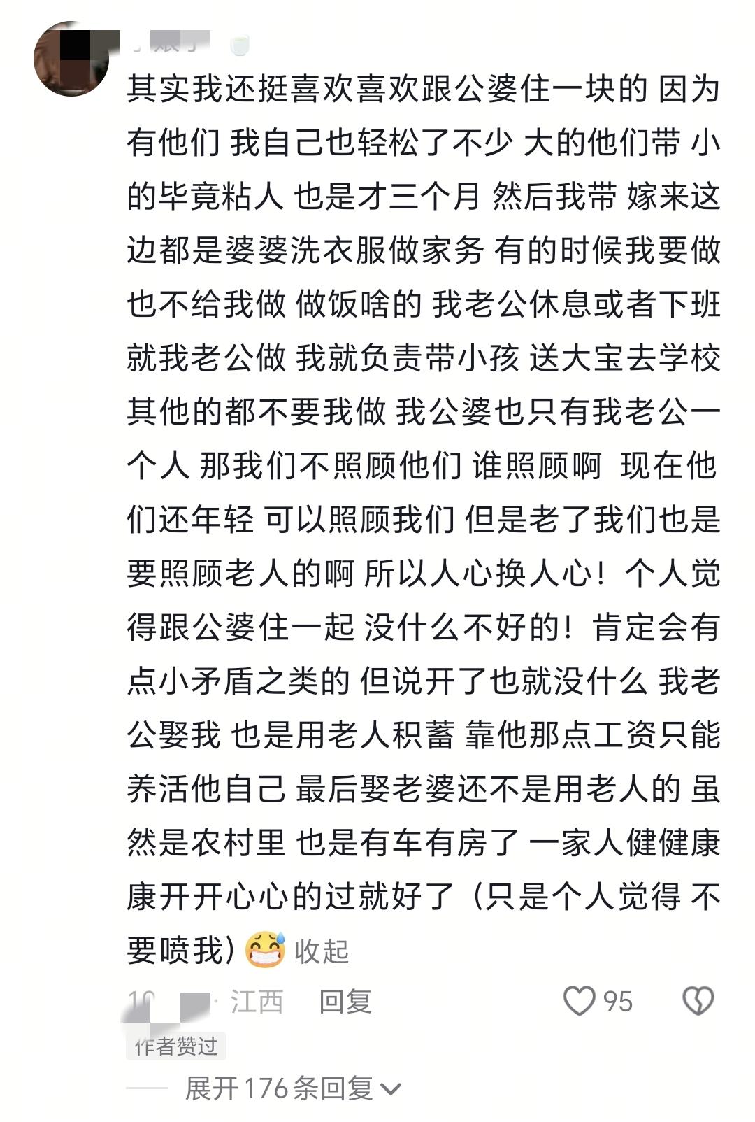 另外一個江西的網友卻提到:挺喜歡跟公婆住在一起,因爲有他們,我們也輕鬆了不少,大的他們帶,小的黏人自己帶,基本上都是婆婆洗衣服做家務。更重要的是自己家養兩個孩子壓根就養不起,都是用老人的積蓄來養活孩子。