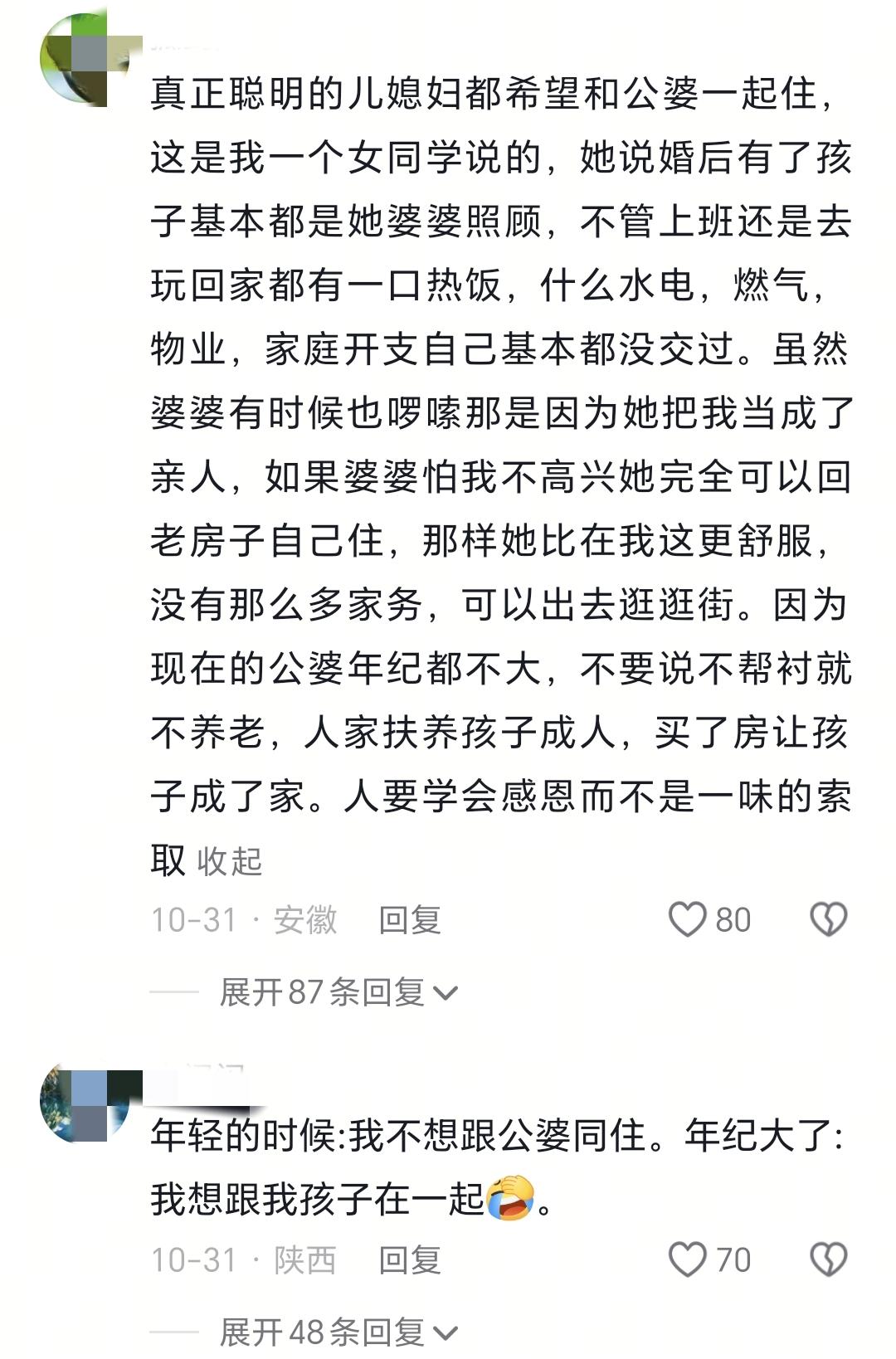 更有一個安徽的網友說:真正聰明的兒媳婦都是希望跟公婆在一起住的,婚後有了孩子基本都是婆婆照顧,不管去上班還是去玩,回家都有一口熱飯。