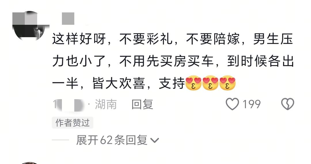 有一個湖南的網友就提到:這樣也很好,不要彩禮,不要陪嫁,男生的壓力比較小了,也不用買房買車,大家各出一半,皆大歡喜。
