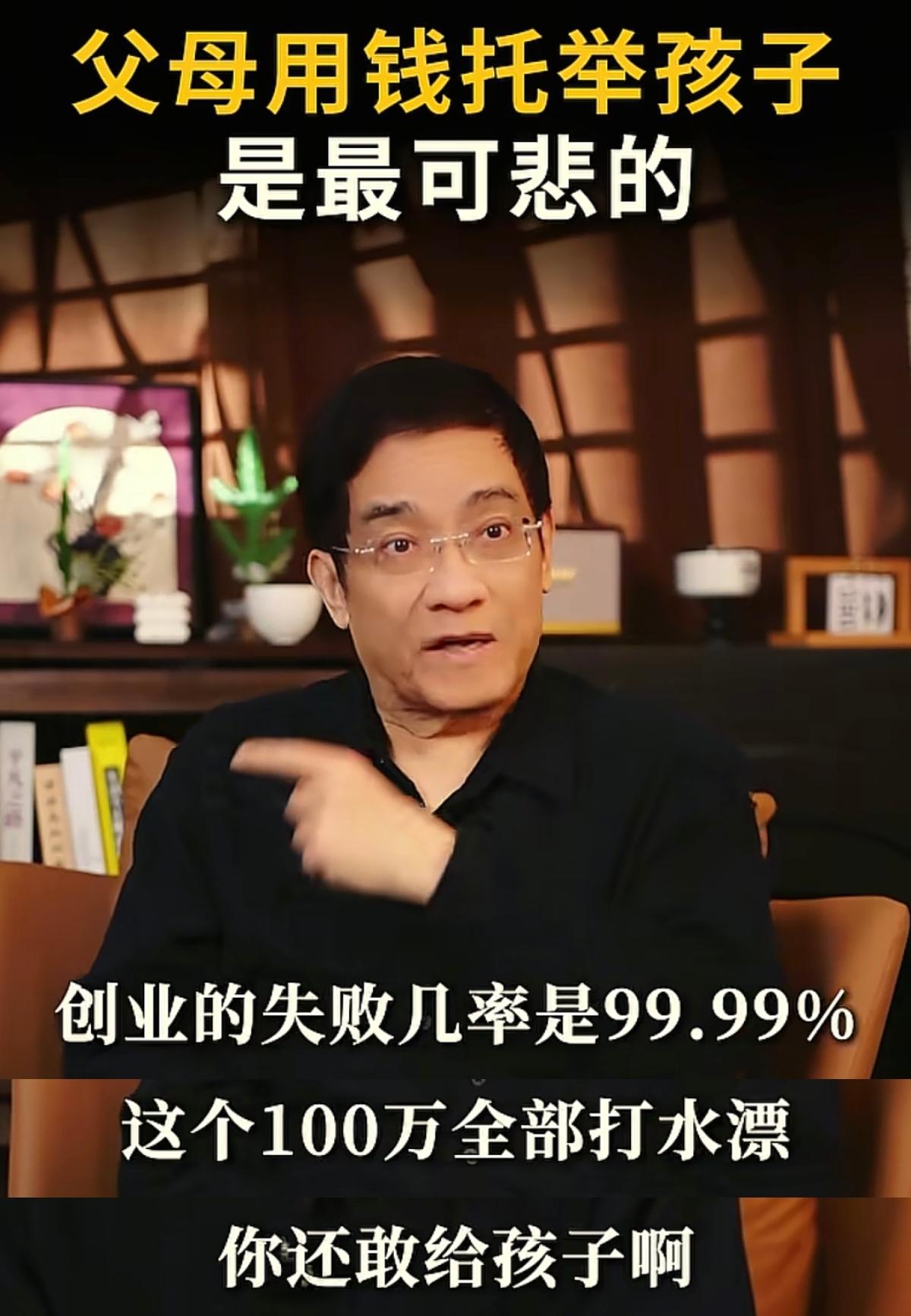 要知道現在創業的失敗率是99.99%,也就是你這個錢大概率是打水漂,給你兒子去玩一場創業的遊戲,然後就玩掉了,而這些錢是你辛苦一輩子,省喫儉用攢下來的錢。