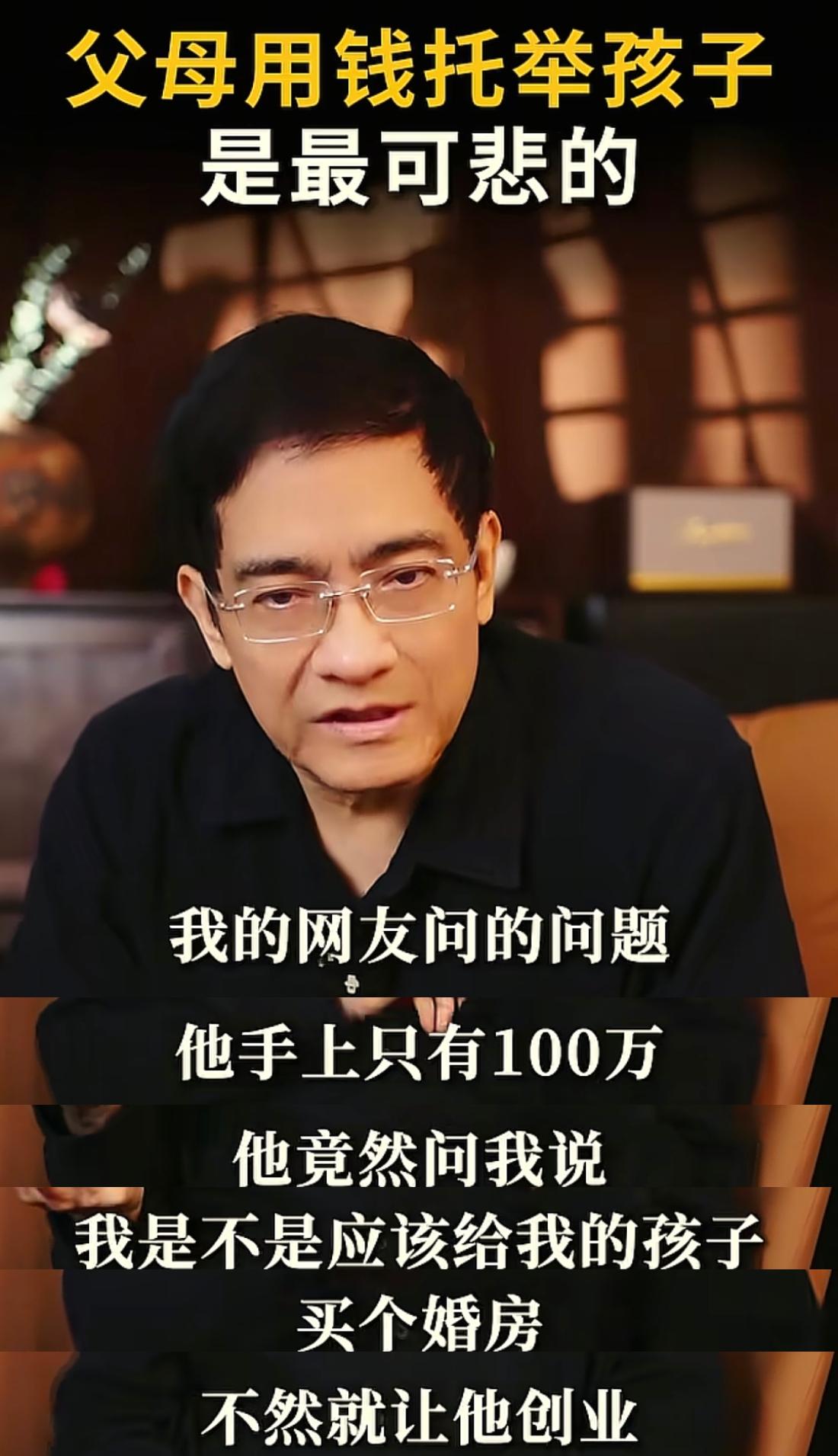 著名的經濟學家郎鹹平就接到一個粉絲的提問,這個粉絲就說:我現在有100萬,我是給自己的孩子買婚房呢,還是給自己的兒子創業?