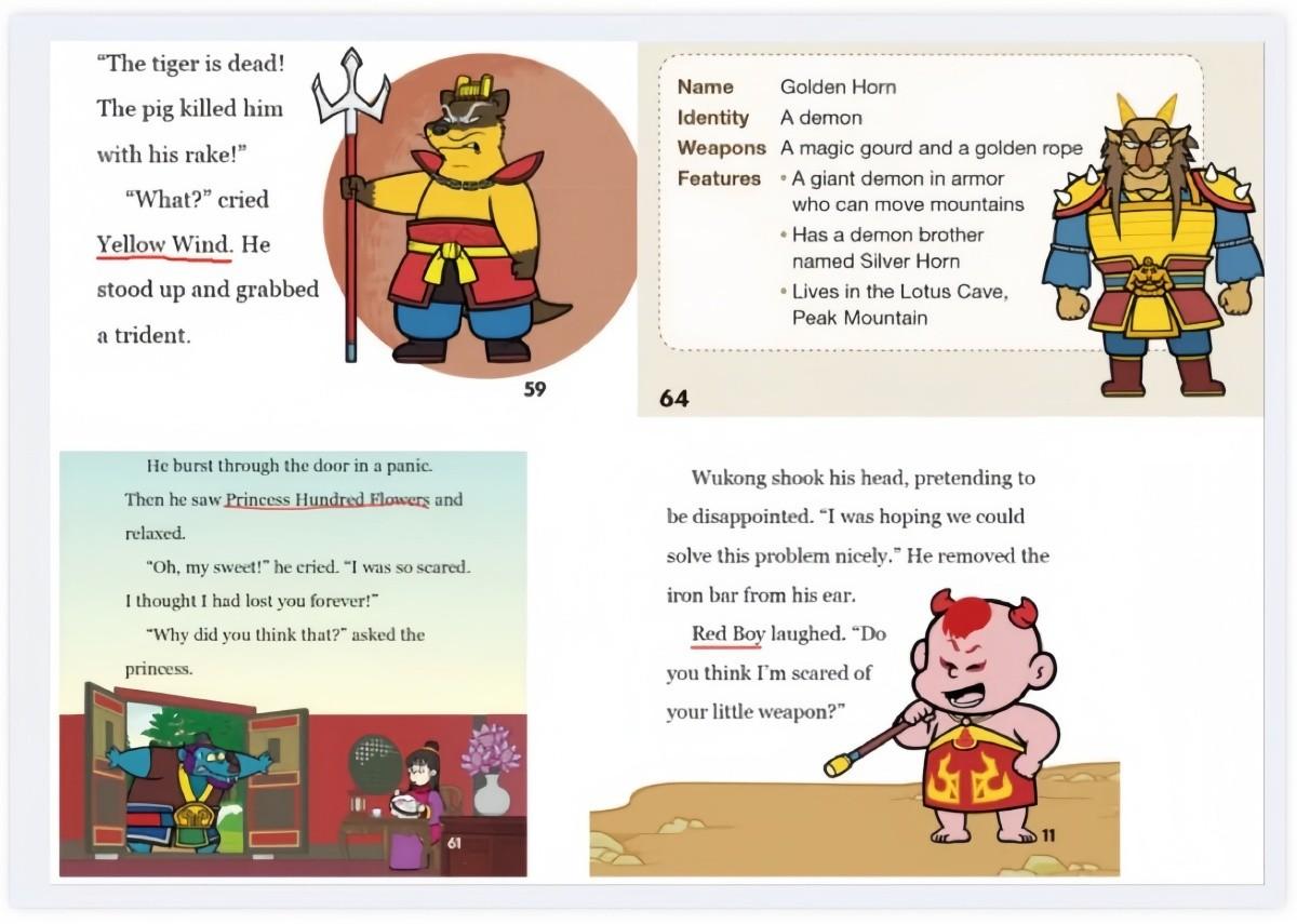 還有,黃風怪 Yellow Wind(黃色+風)、金角大王Golden Horn(金色+角)、玉皇大帝Jade Emperor(玉+皇帝)、百花公主Princess Hundred Flowers(公主+百花)、紅孩兒Red Boy (紅色+男孩),這樣的命名方式很容易就能幫助孩子把人物名字和他的特徵聯繫起來,不會造成人物混亂。