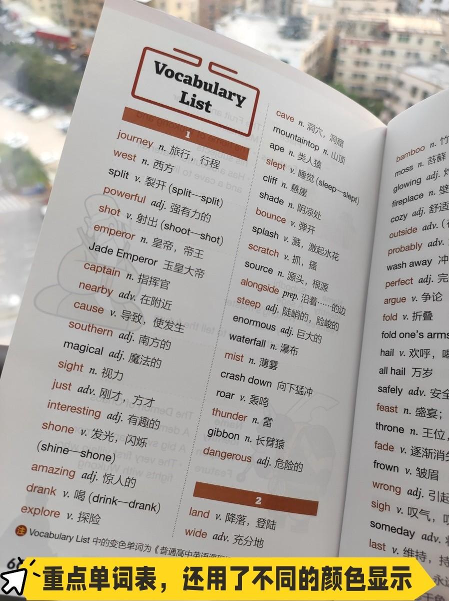 而且每本書最後都附上了重點單詞表,還用了不同的顏色顯示,其中變色的單詞是《普通高中英語課程標準》要求掌握的常見單詞,掌握了這些詞彙應對中考妥妥的。