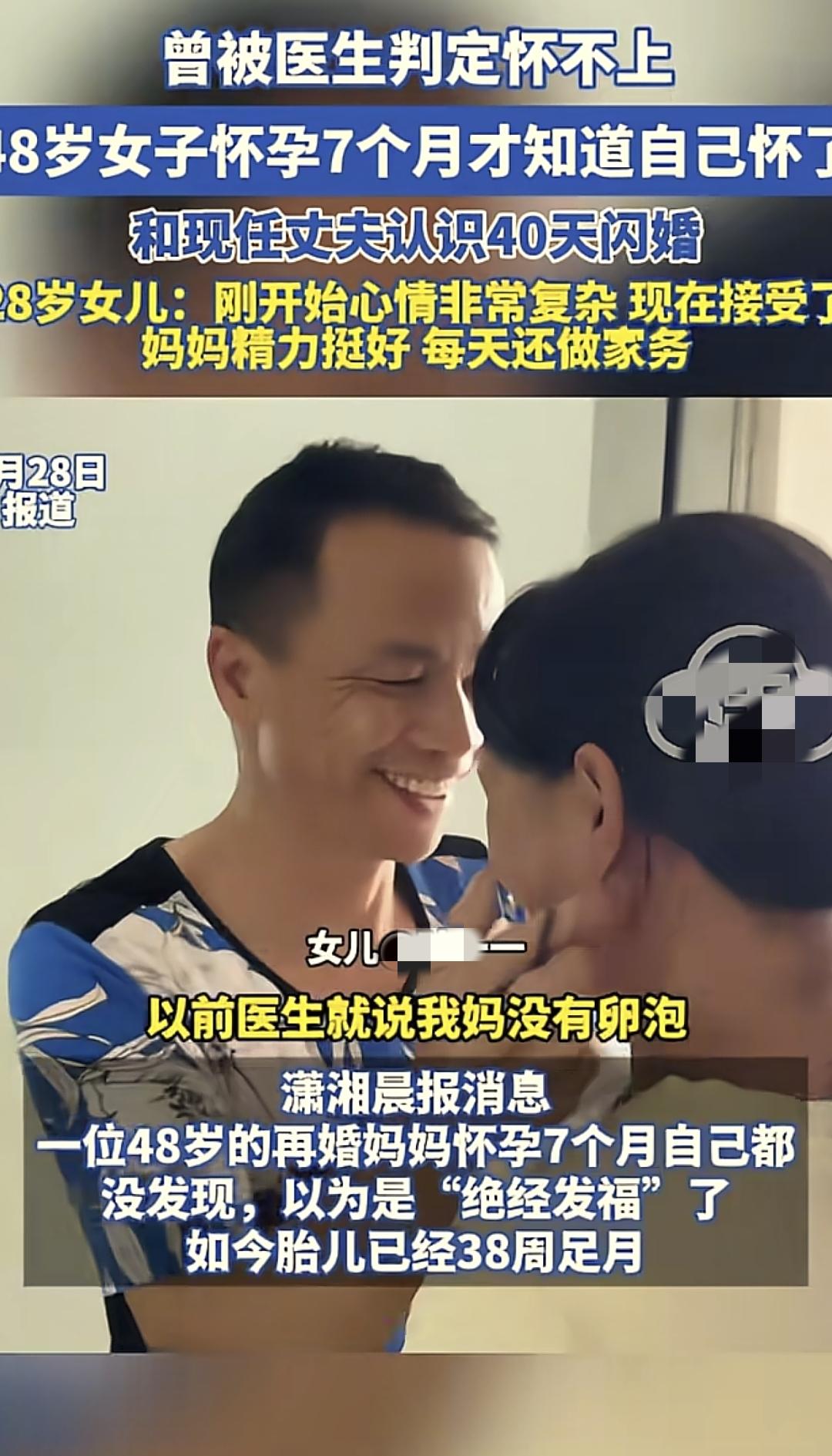 結果找到一個老伴的時候,兩個人都各自有了孩子,以爲就是重組家庭過日子而已,因爲以前醫生都說她可能懷不上孩子了,所以也沒有做任何的避孕措施,當她發現月經不來的時候,她就以爲自己是絕經了……