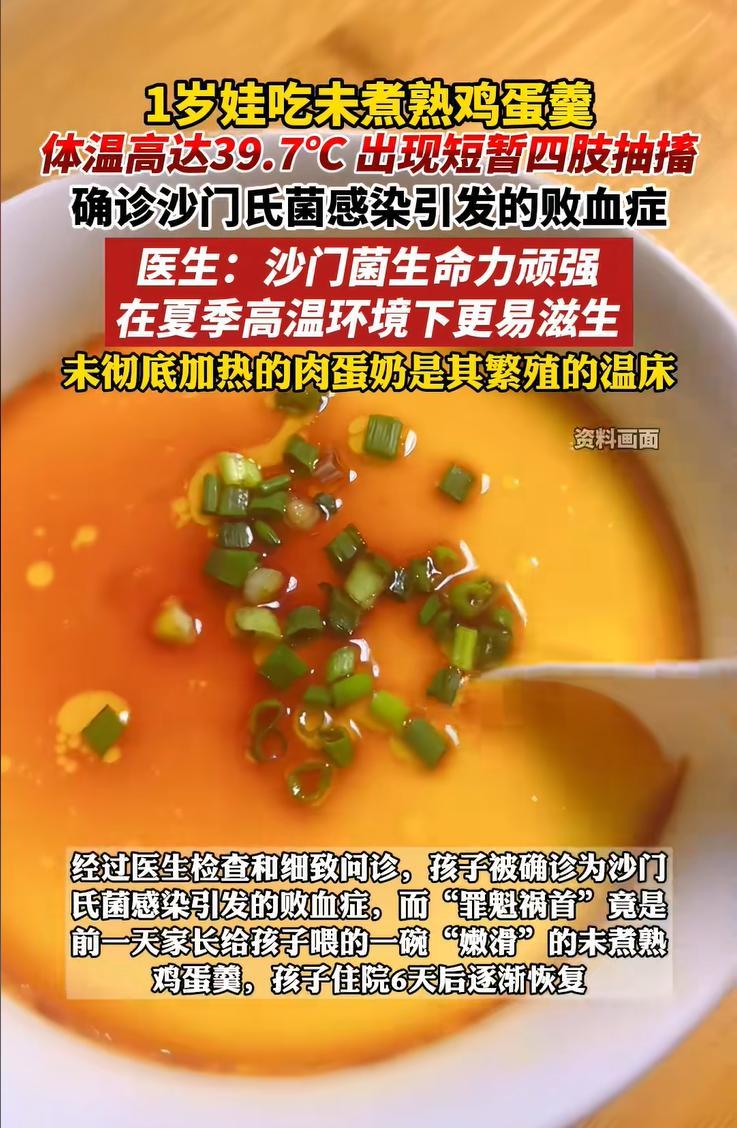 就比如像這個媽媽的雞蛋羹,還有一些家長喜歡喫溏心蛋,也就是雞蛋的蛋黃沒有凝固,蛋白甚至半透明狀的,這時候殺菌也不徹底,也容易有一些致病菌殘留。
