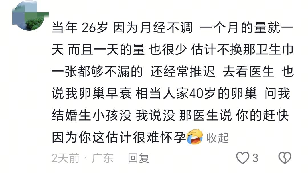 而評論區還有一個更年輕的網友就說自己26歲,因爲月經不調,一個月的量就一天,而且量也很少,去看醫生就說自己是卵巢早衰,相當於人家40歲的卵巢,問她有沒有結婚生孩子,她說沒有,結果醫生就說你趕快,因爲你估計很難懷孕。