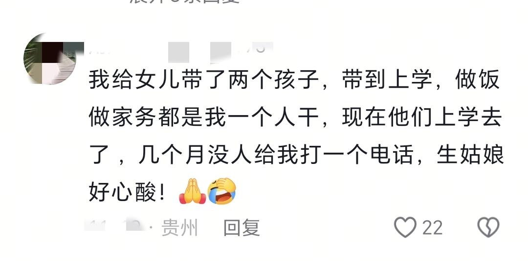 一個貴州的外婆說:給自己的女兒帶了兩個孩子,帶到上學做飯做家務都是一個人幹,現在孩子上學了幾個月沒有人給我打一個電話,生個姑娘真的好心酸。