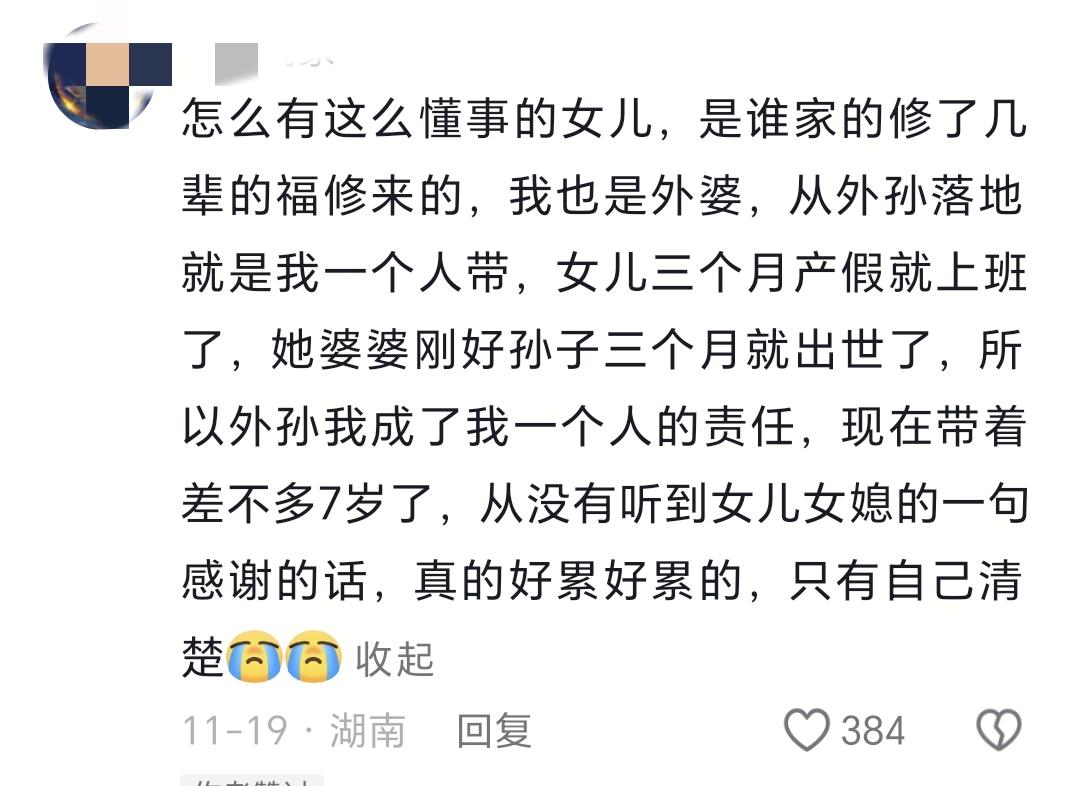 湖南的外婆就說女兒三個月產假上班,外孫成了自己一個人的責任,現在帶到差不多7歲了,沒有聽到女兒女婿一句感謝的話,真的好累。
