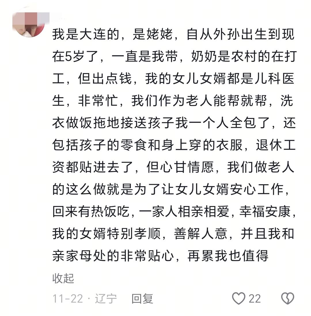 還有一個遼寧的外婆就說:作爲姥姥幫帶孩子,不僅出力家務全包,而且退休工資還倒貼,不過幸好女婿比較孝順。