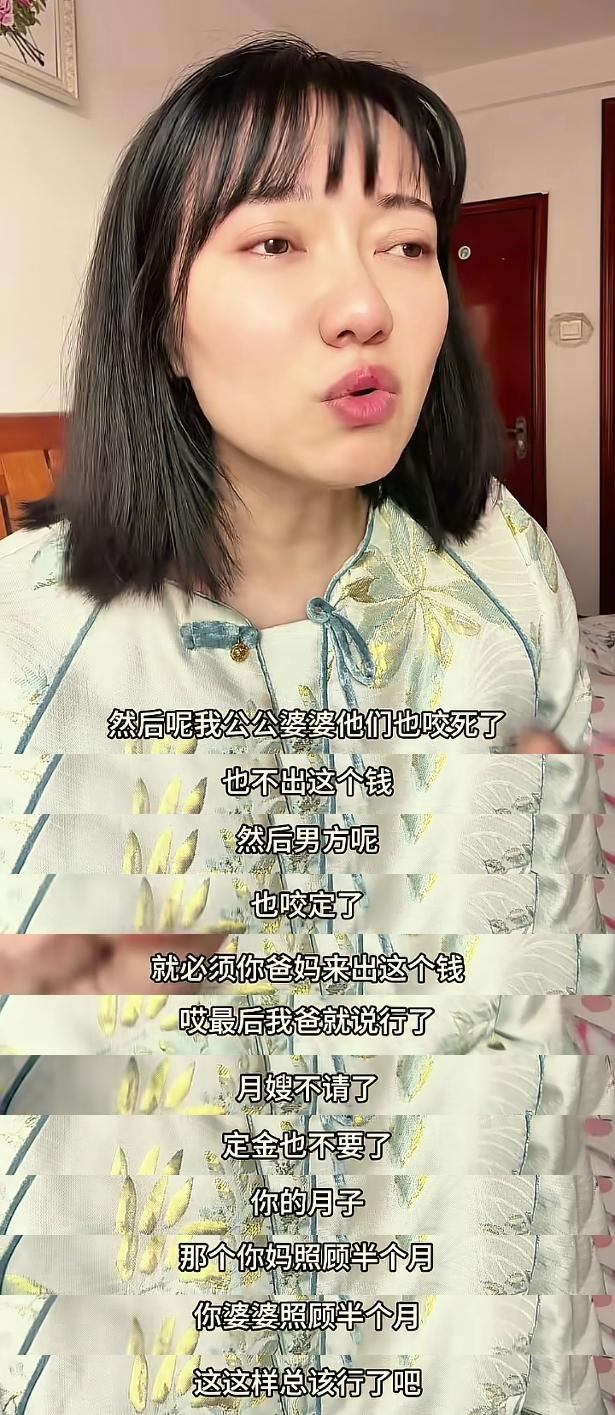 萬萬沒有想到,公公婆婆也不願意出這個錢,然後自己的爸爸就非常通情達理,就說,大家吵來吵去都覺得哪個付這個錢都不合理,乾脆就這樣吧,就前面的定金也不要了,也不請月嫂了,就一個人照顧半個月,前面的半個月由孩子的外婆來照顧,後面的半個月由孩子的奶奶來照顧,這樣子也不用請月嫂了,也不用吵了。