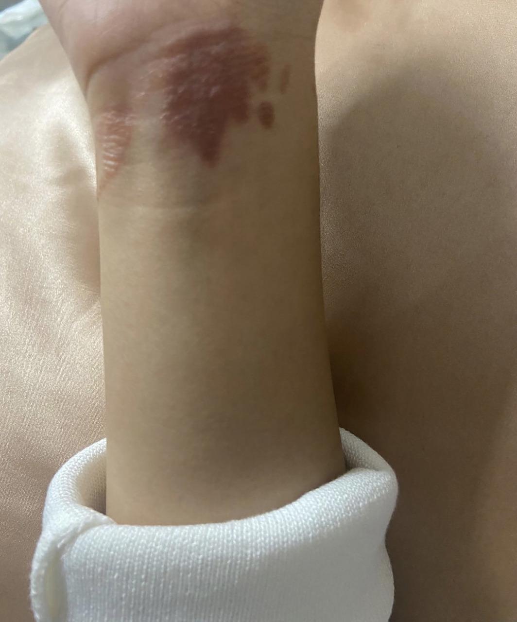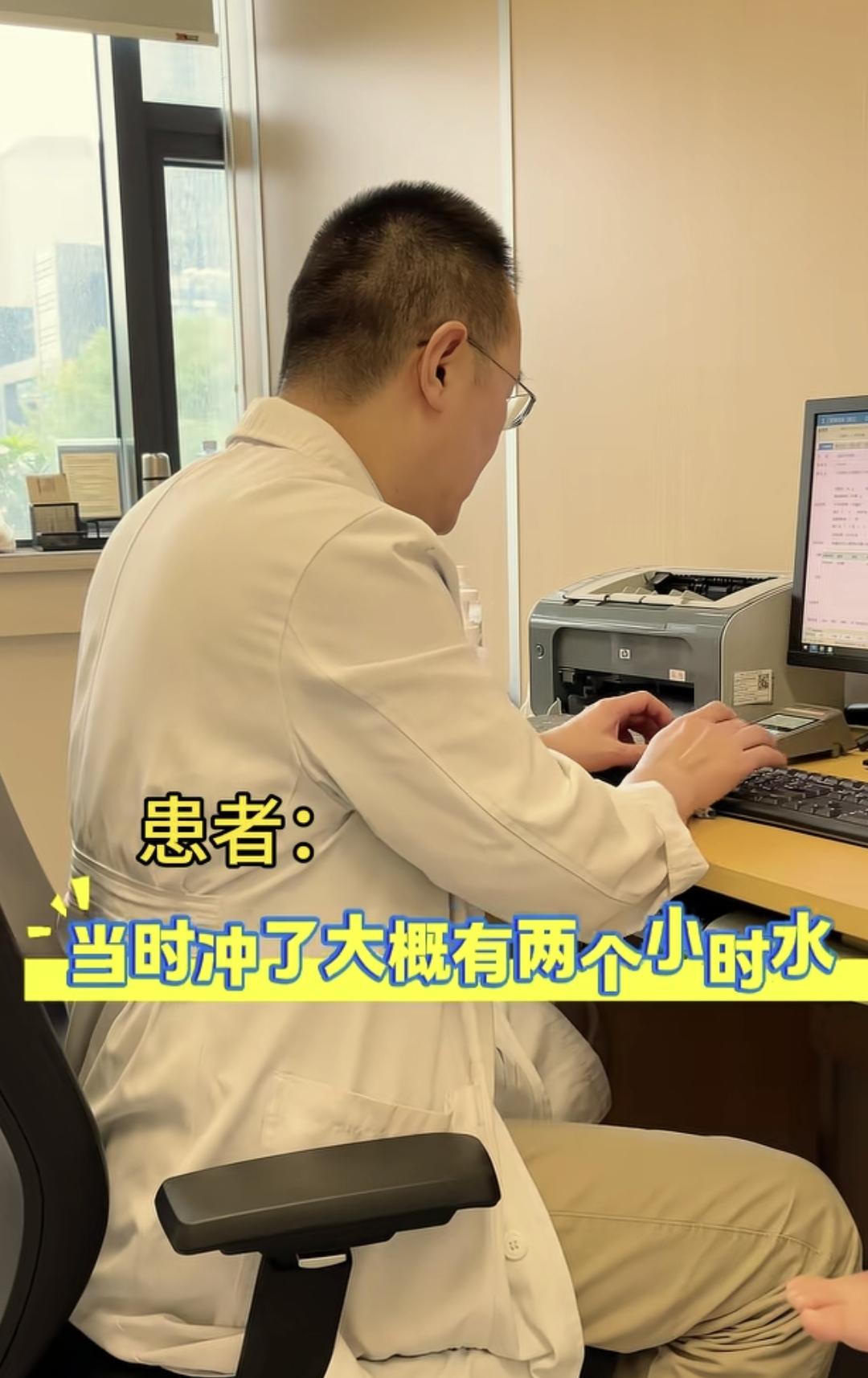 於是她抱着孩子就去水龍頭那裏用流動的冷水來衝。她記得網上說建議衝半小時,但心想“衝得越久肯定越好”,於是足足衝了兩個小時。醫生還說要脫,而自己孩子的腳背上沒有任何的東西不需要脫。