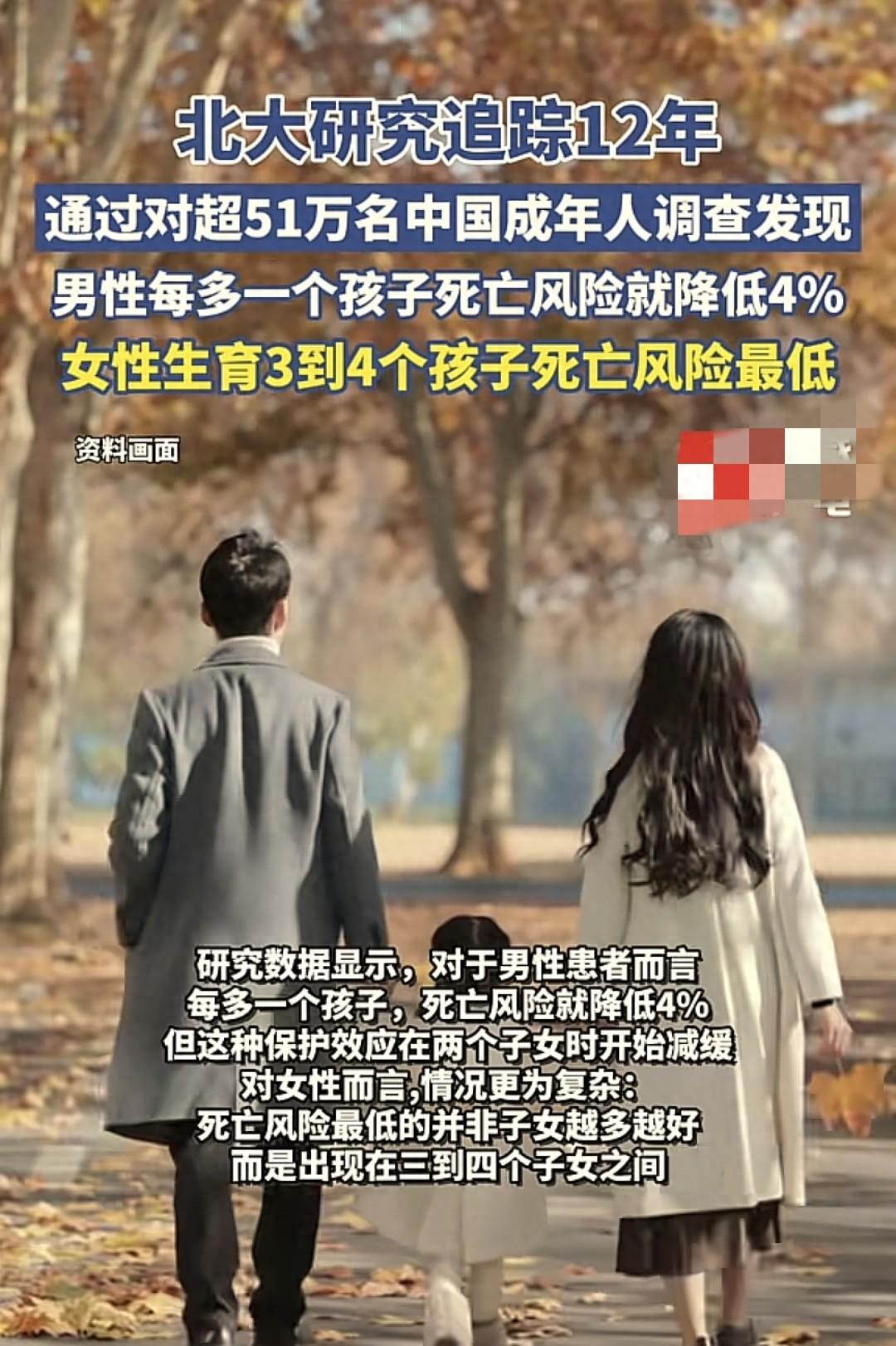 北京大學公共衛生學院對50餘萬中國男女進行了長達12年的跟蹤調查,發現了一個有趣的現象:男人每多生一個孩子,死亡風險降低4%;而女性最低的死亡風險,則出現在生育3-4個子女之間。