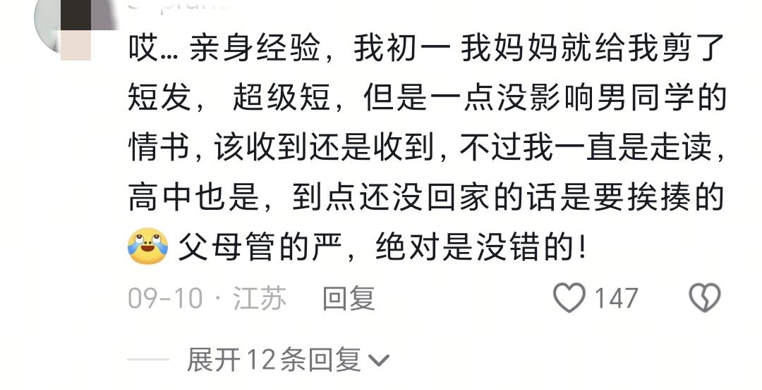 一位江蘇的女孩就說,她初一那年,媽媽就把她頭髮剪得極短。即便如此,仍有男生給她遞情書,但父母要求她必須走讀,到點沒回家就會捱揍。她覺得,正是父母當時的嚴格,才讓自己沒有走彎路。