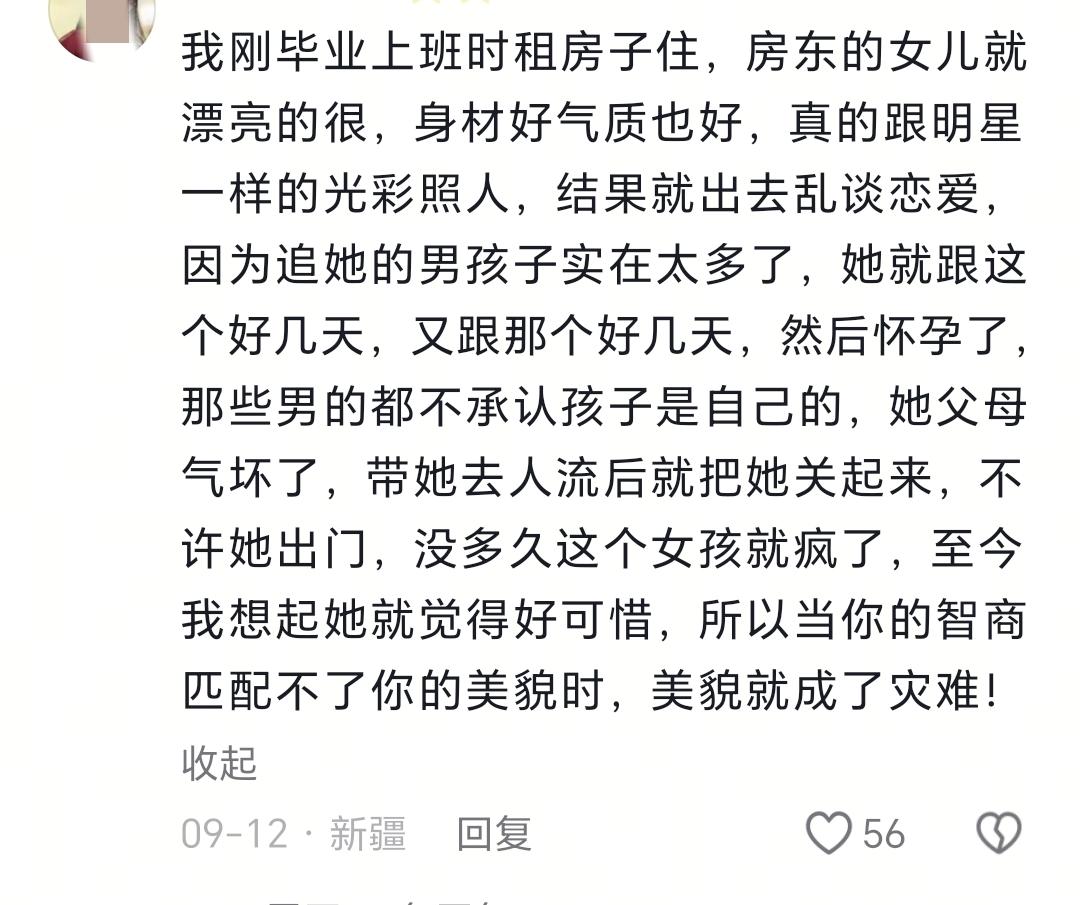 一位新疆的網友說,他畢業後租房時,房東的女兒非常漂亮,身材好氣質佳,像明星一樣。但她因爲追求者太多,感情生活很混亂,今天跟這個好,明天跟那個好,後來懷孕了,連孩子父親是誰都不知道。父母帶她去流產後,把她關在家裏不許出門。結果沒多久,這個女孩就被逼瘋了。