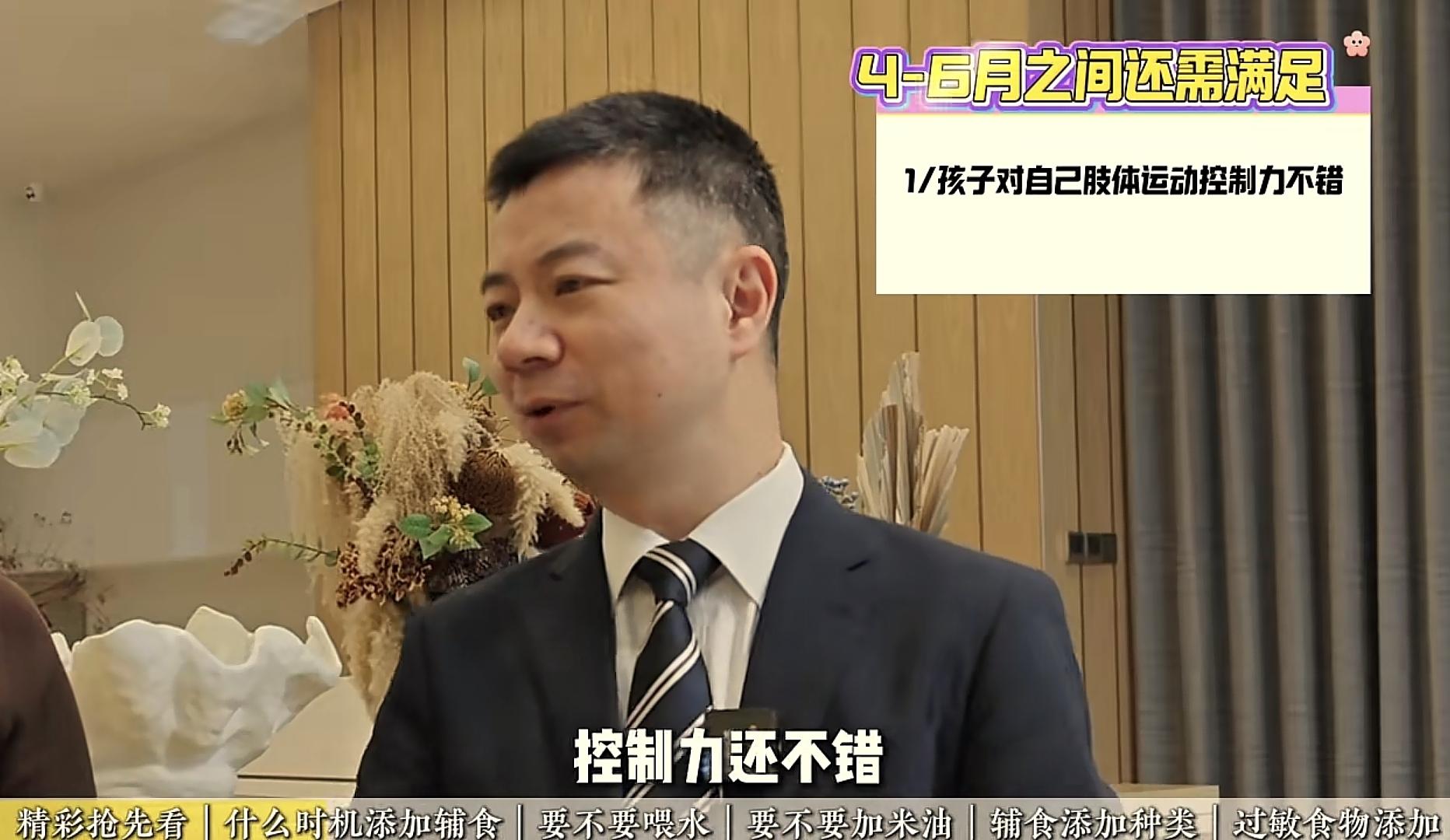 比如孩子趴在牀上的時候,他能用整個手掌撐在地上,把自己的整個身體胸部全部抬起來,而且能夠支撐一小段時間,比如說十幾秒,那說明孩子對自己軀體的控制能力已經變得比較強了,他的大動作發育也是比較提前的,這時候給他添加輔食是比較容易的,他也能夠自己坐得穩,頭也能夠搖來搖去。