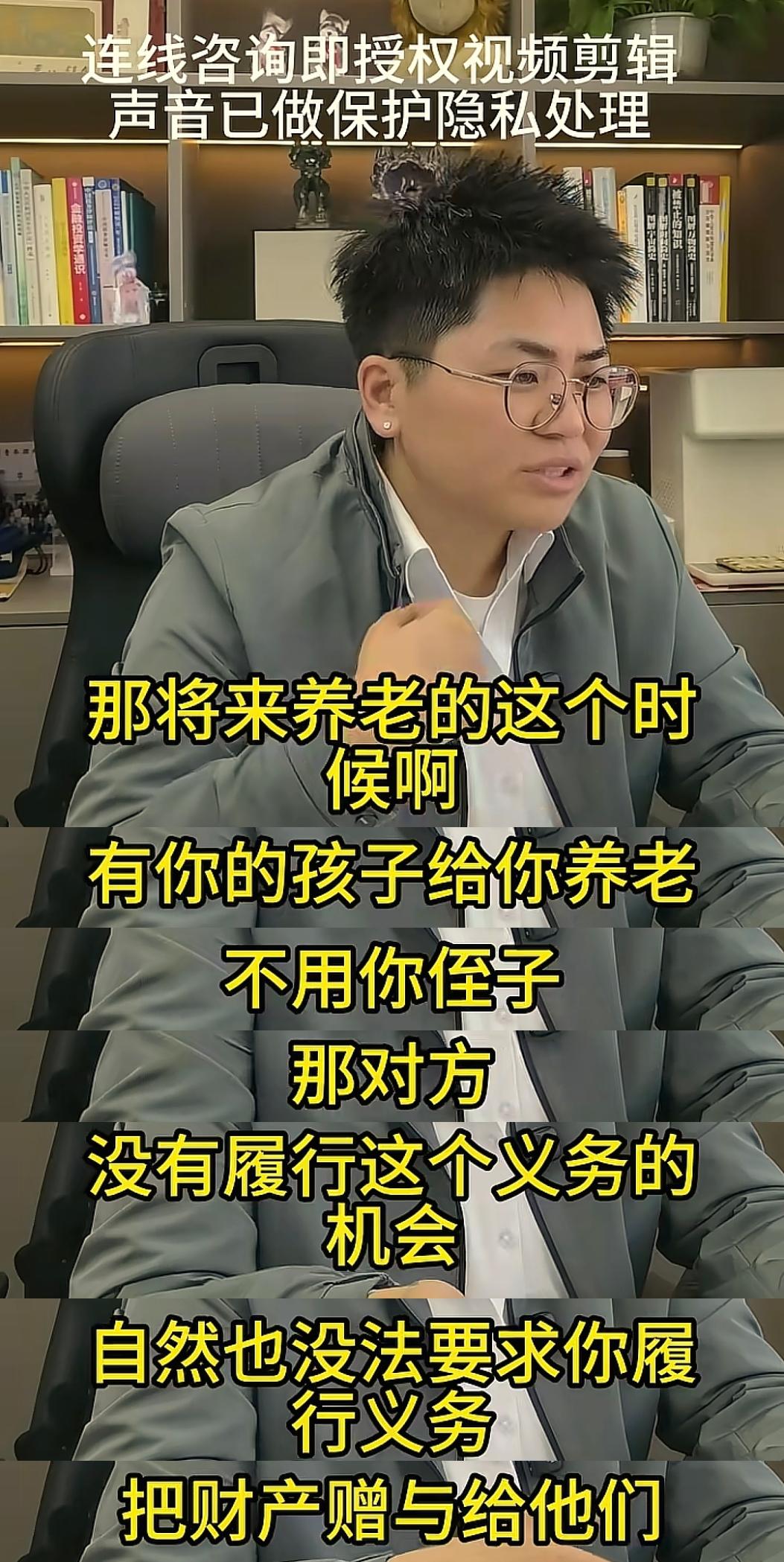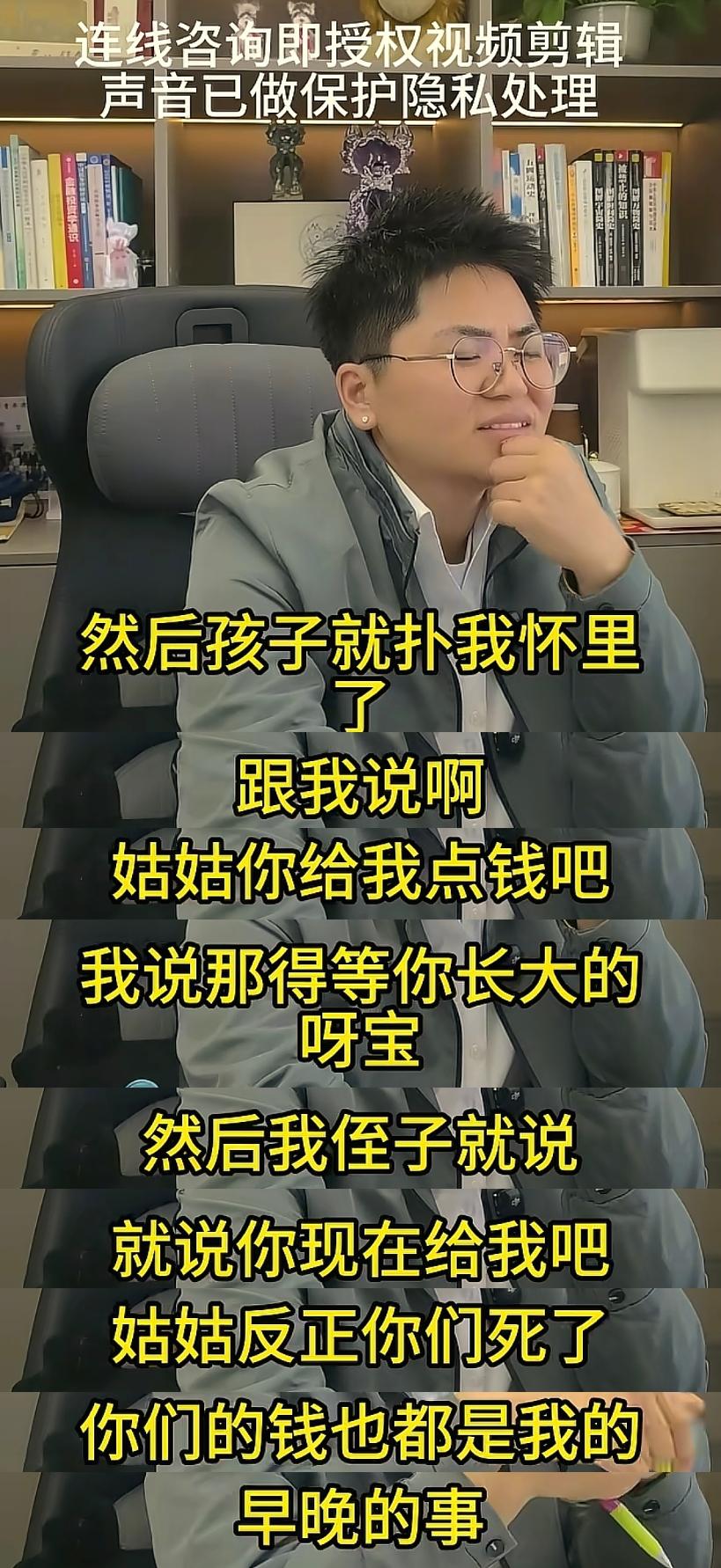 姑姑覺得好笑又心疼,逗他說:“等你長大了再說。”侄子卻突然接了一句:“你現在就給我嘛,反正你們死了,錢都是我的,早給晚給有什麼區別。”