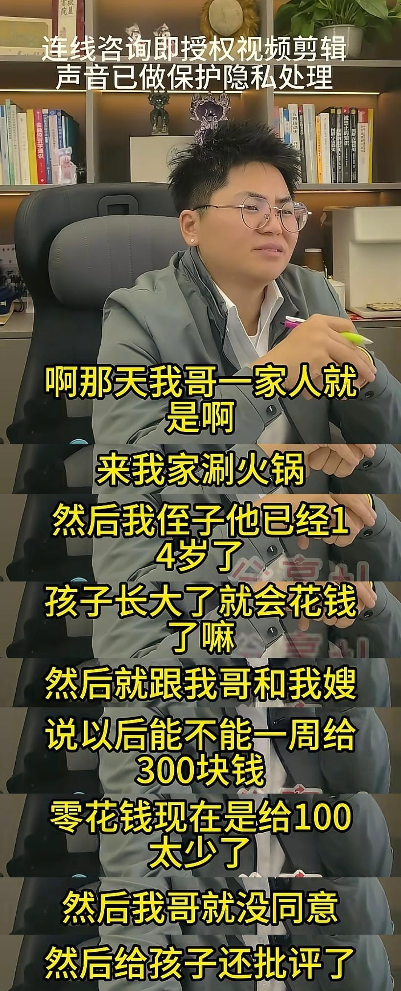沒想到,一場家庭燒烤,徹底打破了這份“安心”。那天,14歲的侄子跟着父母來家裏喫飯。他每週零花錢只有100元,想漲到300元卻被父親拒絕,還捱了批評。