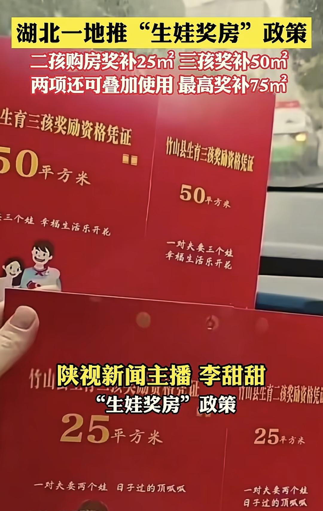 前天湖北竹山縣生育兩孩購房獎補25平方米,生育三孩獎補50平方米衝上熱搜。比如說一個家庭生了二胎之後又生三胎,相當於可以補75平方米,也就是家庭困難的話,就直接買個75平方米的房子,壓根就不用自己出錢……