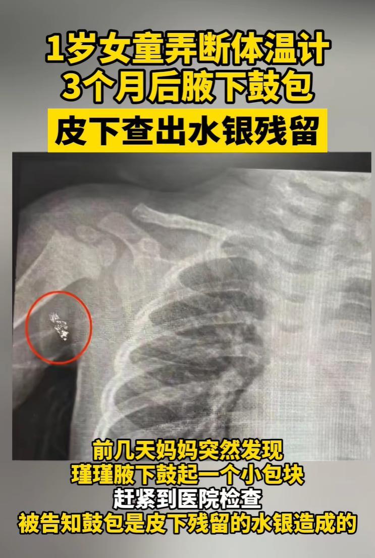 醫生通過儀器檢查發現,孩子腋下的鼓包居然是皮下殘留的水銀造成的。媽媽愣了一會兒,往前回想,才記起三個月前測體溫時孩子弄破體溫計的事。當時因爲傷口很小,她沒有留意,導致水銀殘留腋下,形成了包塊。