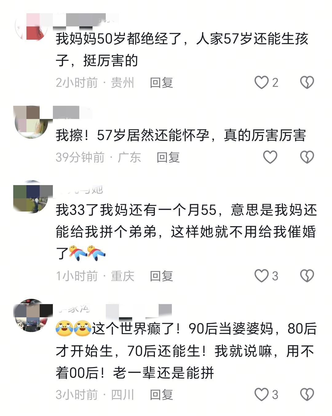 這讓網友覺得非常的詫異:50多歲不是早就絕經了嗎?有網友說自己媽媽48歲就絕經了。還有網友說自己媽媽46歲都絕經了,她57歲還能生,實在是太厲害了。