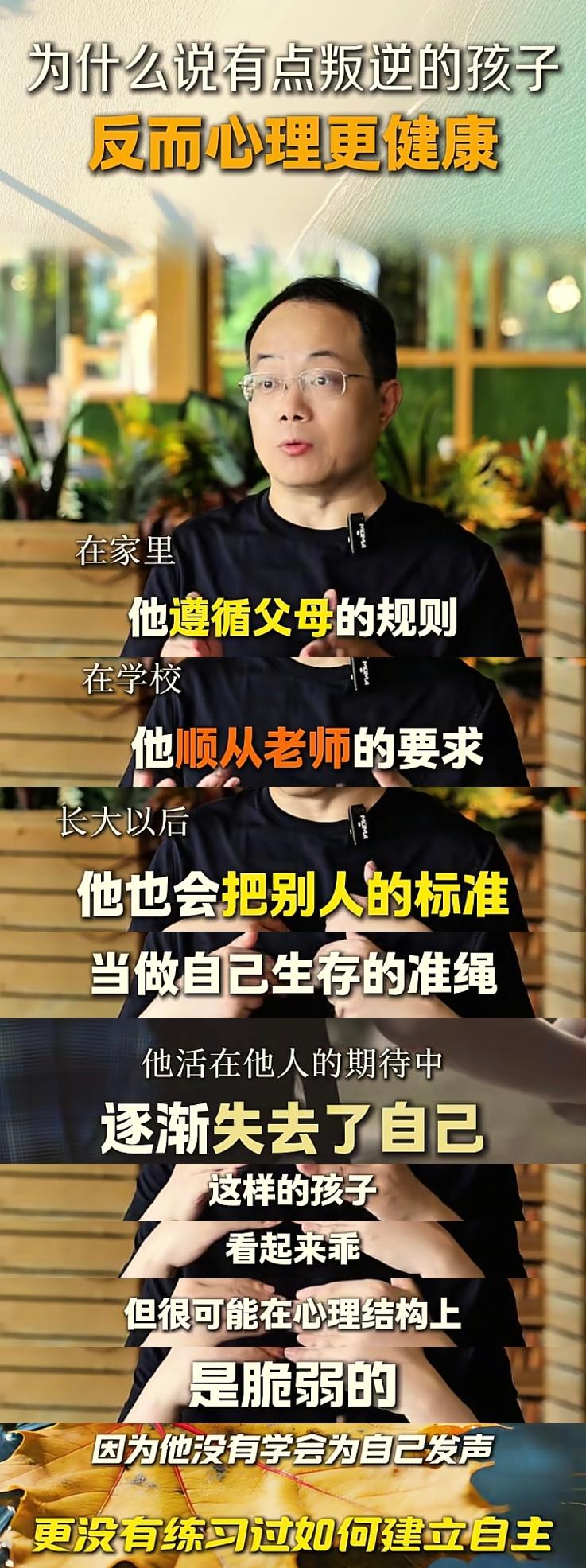 如今青少年抑鬱率居高不下,心理問題頻發。心理學家武志紅曾指出:有點叛逆的孩子,心理往往更健康。
