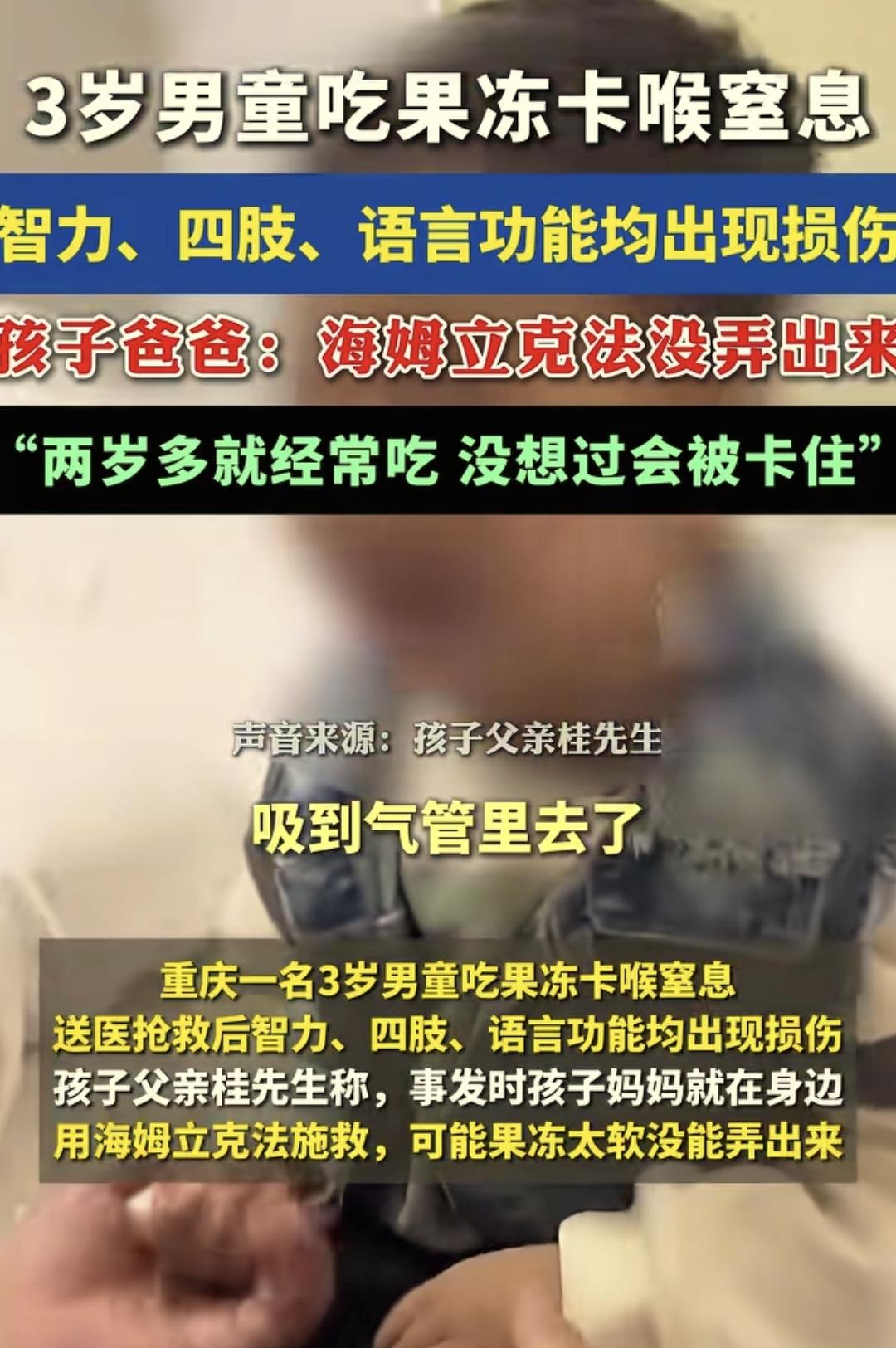 2024年,重慶一名3歲男童在喫果凍時不小心卡住喉嚨。家長雖立即使用了海姆立克急救法,但可能因操作不當或驚慌,也可能是果凍卡得太裏面了,沒有及時把喉嚨裏面的果凍給拍出來。