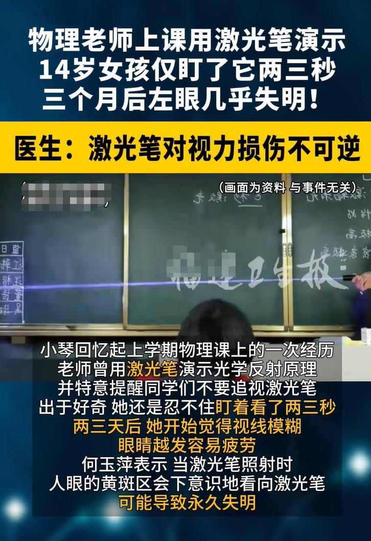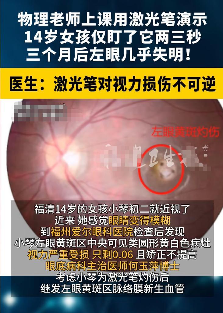 如果是近視還可以戴眼鏡,但這個是已經是眼底損傷就沒有辦法矯正了。後來小琴回憶起原來老師在上物理課的時候用激光筆來給他們做實驗,告訴他們千萬不要追視激光筆,但是小琴特別的好奇,追着看了一下,結果眼睛就受傷了。
