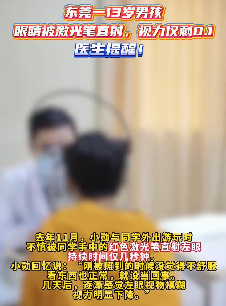 東莞有一個13歲的男孩,跟同學在外面玩的時候,被同學手中的紅色激光筆直射了左眼,持續幾秒鐘,剛照到的時候覺得不舒服也沒當回事,後來就發現視力在慢慢下降,再去醫院檢查的時候就發現,黃斑已經有裂孔了,他的視力僅剩下0.1。