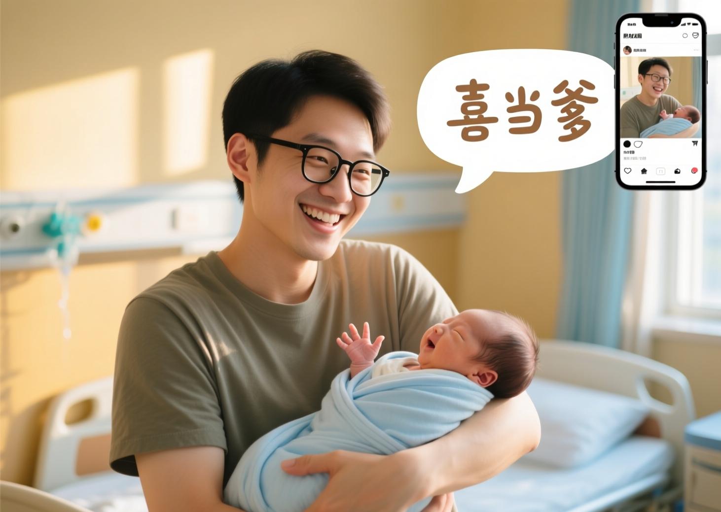 老婆生完孩子後,他喜滋滋地抱着娃自拍,發了條朋友圈,文案就三個字——“喜當爹”。